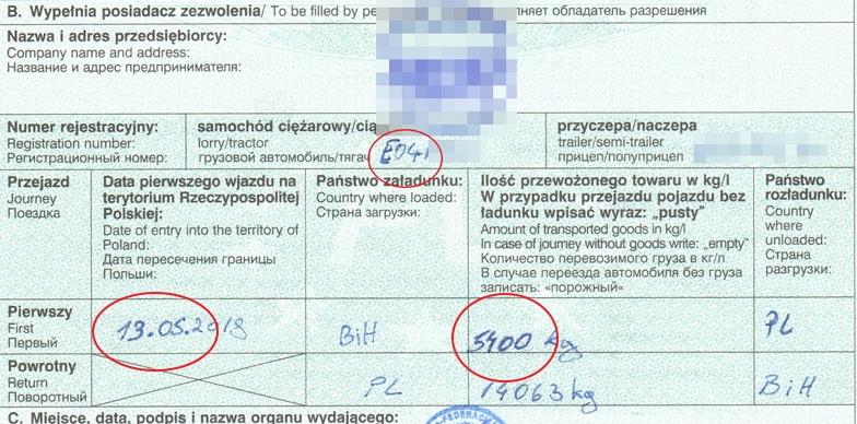 16 maja wieczorem na autostradzie A1 w Godowie inspektorzy zatrzymali do kontroli pojazd z Bośni i Hercegowiny. Auto przewoziło profile okienne z Włocławka do miejscowości Breko w Bośni. Kierowca okazał dokumenty, które wzbudziły podejrzenie inspektorów. Jednokrotne zezwolenie międzynarodowe na przewóz nosiło wyraźne ślady przerobienia. Z pomocą zmywalnego cienkopisu zmienione zostały pola dotyczące: pierwszego wjazdu na terytorium Rzeczypospolitej (pierwotna data to 21.04.2018 r., kierowca przerobił ją na dzień 13.05.2018 r.) oraz przewożonego ładunku. Zmiany były wyraźnie widoczne w świetle testera do badania autentyczności dokumentów a także w silnym strumieniu światła.
