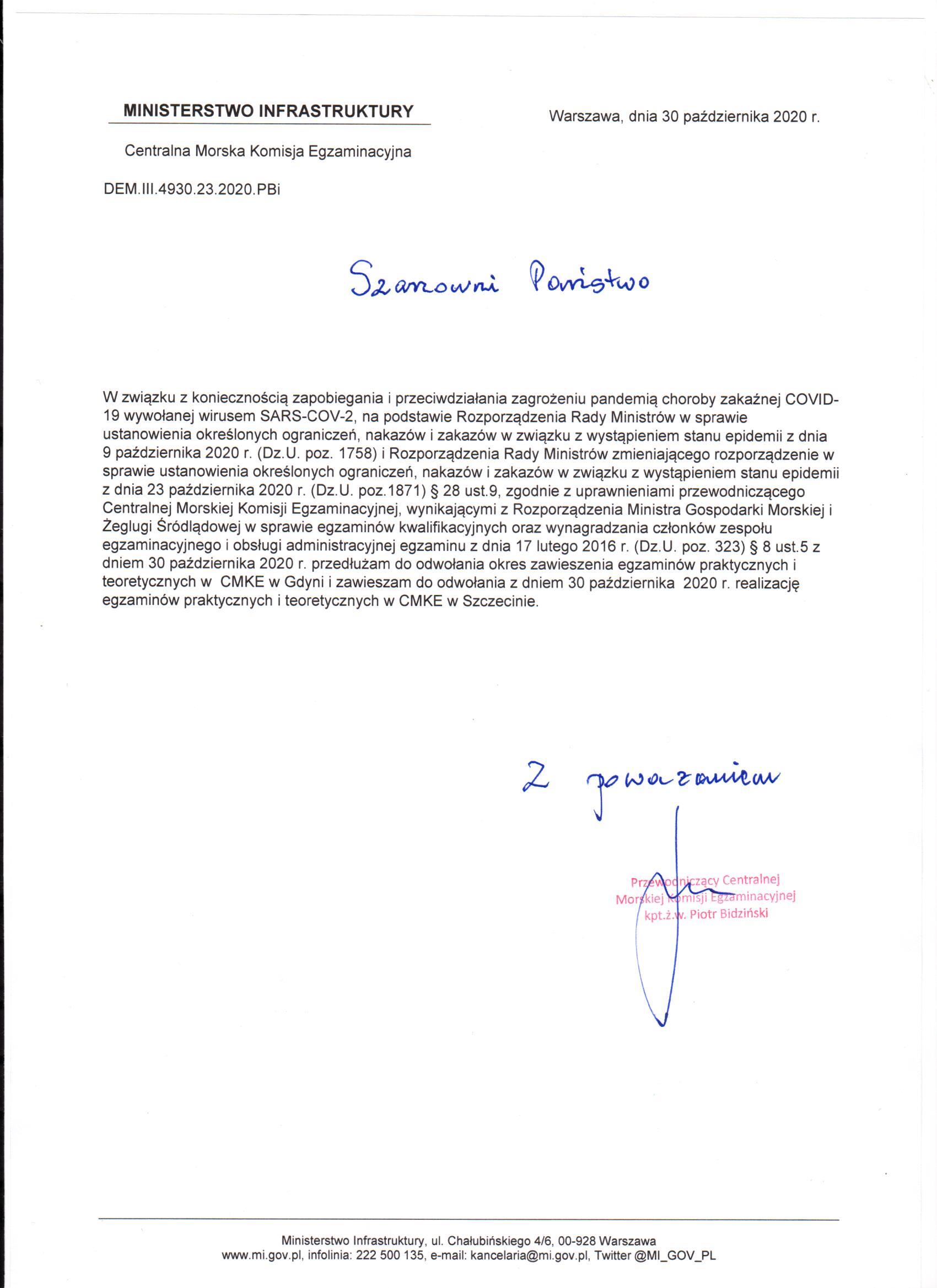Centralna Morska Komisja Egzaminacyjna z dniem 30 października 2020 r. zawiesza proces przeprowadzania egzaminów praktycznych i teoretycznych.