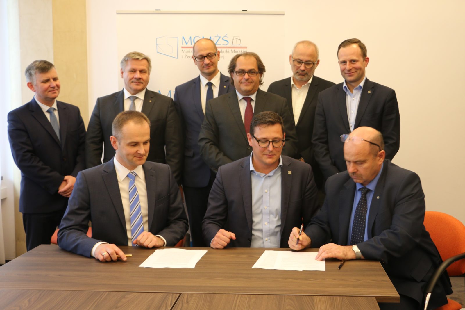 Marek Gróbarczyk, minister gospodarki morskiej i żeglugi śródlądowej uczestniczył w podpisaniu umowy o powołaniu spółki Polski PCS Sp.z.o.o.
