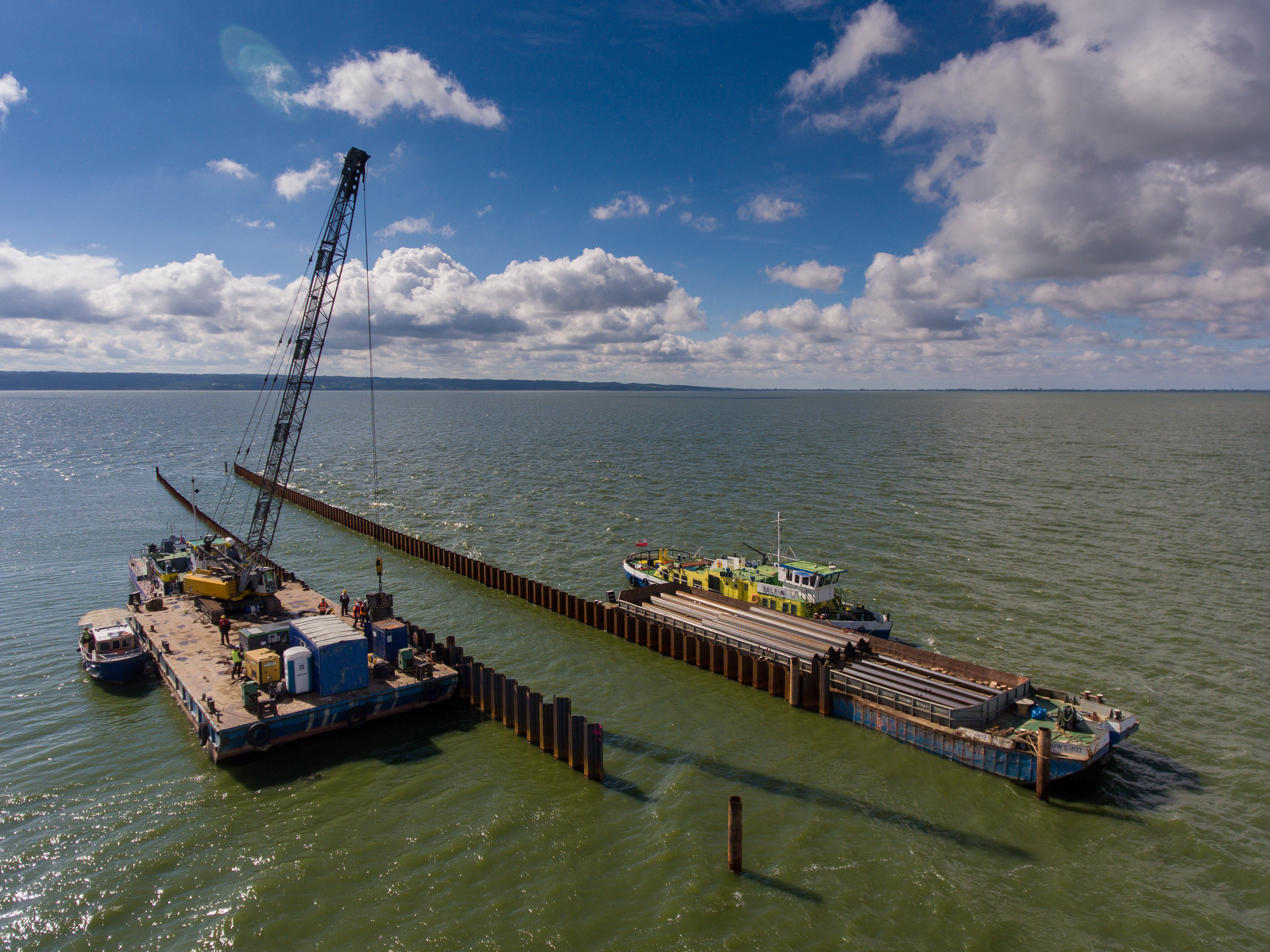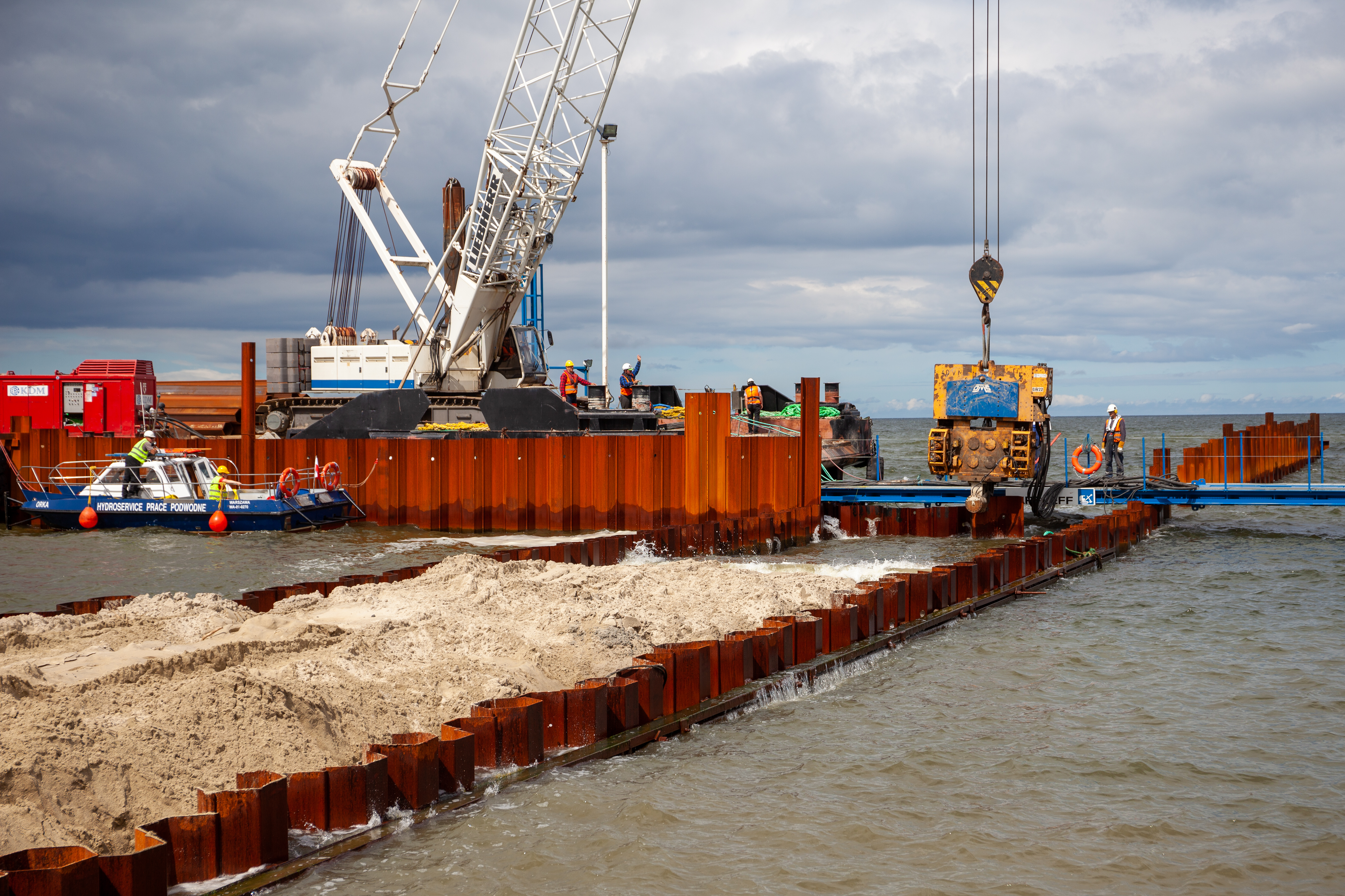 Trwają prace przy inwestycji „Budowa drogi wodnej łączącej Zalew Wiślany z Zatoką Gdańską”. Aktualnie w rejonie Zatoki Gdańskiej na nasadach falochronów zachodniego i wschodniego zakończono montaż specjalistycznych kleszczy i ściągów. Na zasadniczej części falochronu zachodniego rozpoczęło się pogrążanie ścianki szczelnej. W rejonie nabrzeża południowego toczą się roboty pogłębiarskie.