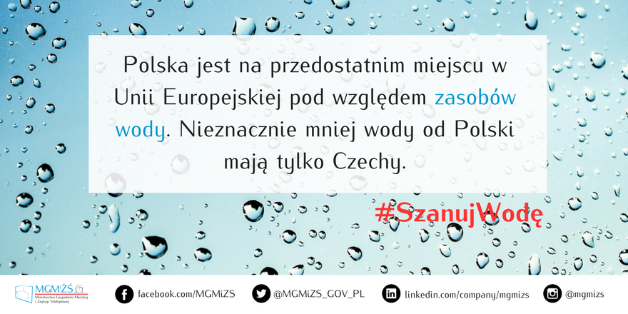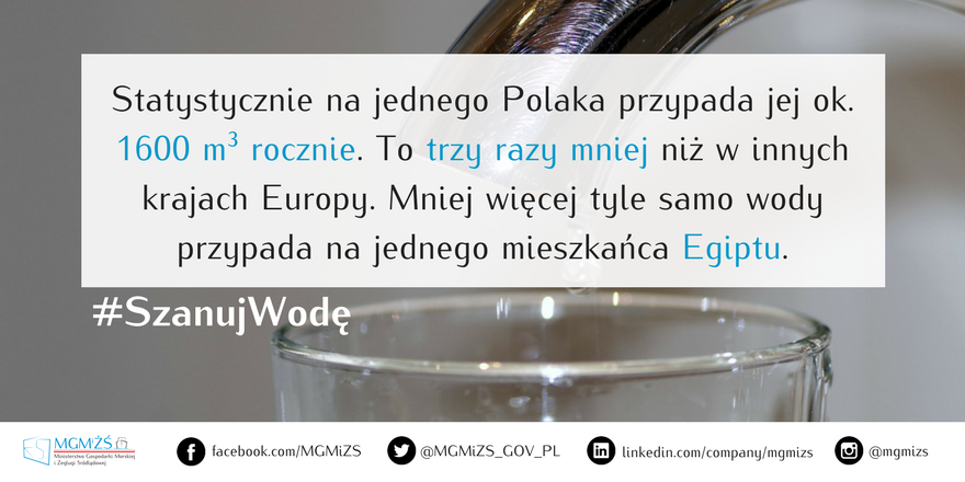 Ministerstwo przypomina, że nieznacznie mniej wody od Polski mają tylko Czechy. Statystycznie na jednego Polaka przypada jej ok. 1600 m³ rocznie – to mniej więcej tyle samo, ile przypada na jednego mieszkańca Egiptu i 3 razy mniej niż średnia dla Europy, która wynosi ponad 4500 m³.