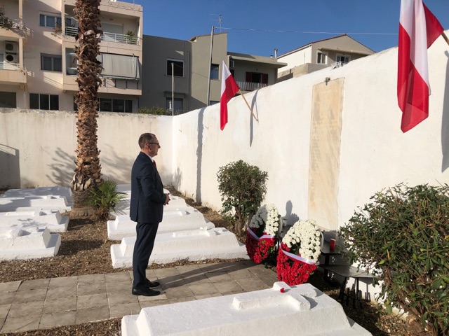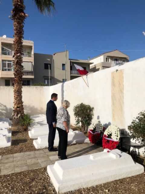 Następnie, zgromadzeni udali się na cmentarz, na którym spoczywają polscy żołnierze polegli w latach 1897-1905, w walce za walność Grecji. Ambasador RP, Pan Artur Lompart i Pani Ewa Skandalis, pracownik Konsulatu Honorowego RP w Heraklionie uroczyście złożyli wieńce przed tablicą upamiętniającą polskich żołnierzy.