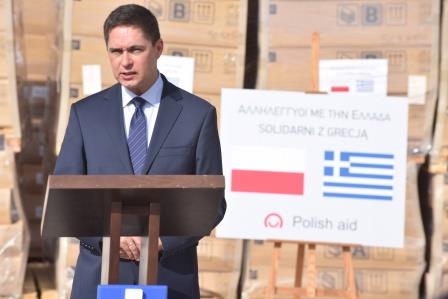 Podczas ceremonii minister G. Koumoutsakos powiedział: „Przyjęliśmy dzisiaj 156 domów modułowych, które pokryją nasze zwiększone ostatnio potrzeby, zwłaszcza po podpaleniu ośrodka recepcyjno-identyfikacyjnego w Moria. Dziękuję Polsce za tę decyzję, za tę inicjatywę. Wysoko cenimy ten gest solidarności. Być może nie zawsze zgadzamy się w pełni w kwestii europejskiej polityki migracyjnej, ale ostatecznie to, co ma znaczenie, to fakt, że Europa działa wspólnie, aby stawić czoła wyzwaniom spowodowanym kryzysem migracyjnym”.