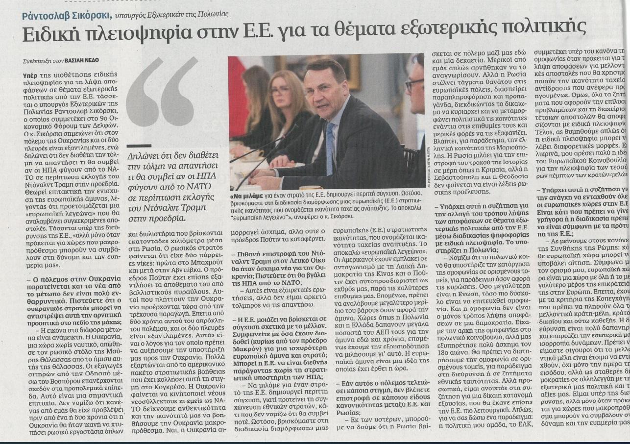 Gazeta "Kathimerini 10 kwietnia opublikowała wywiad z ministrem Sikorskim.