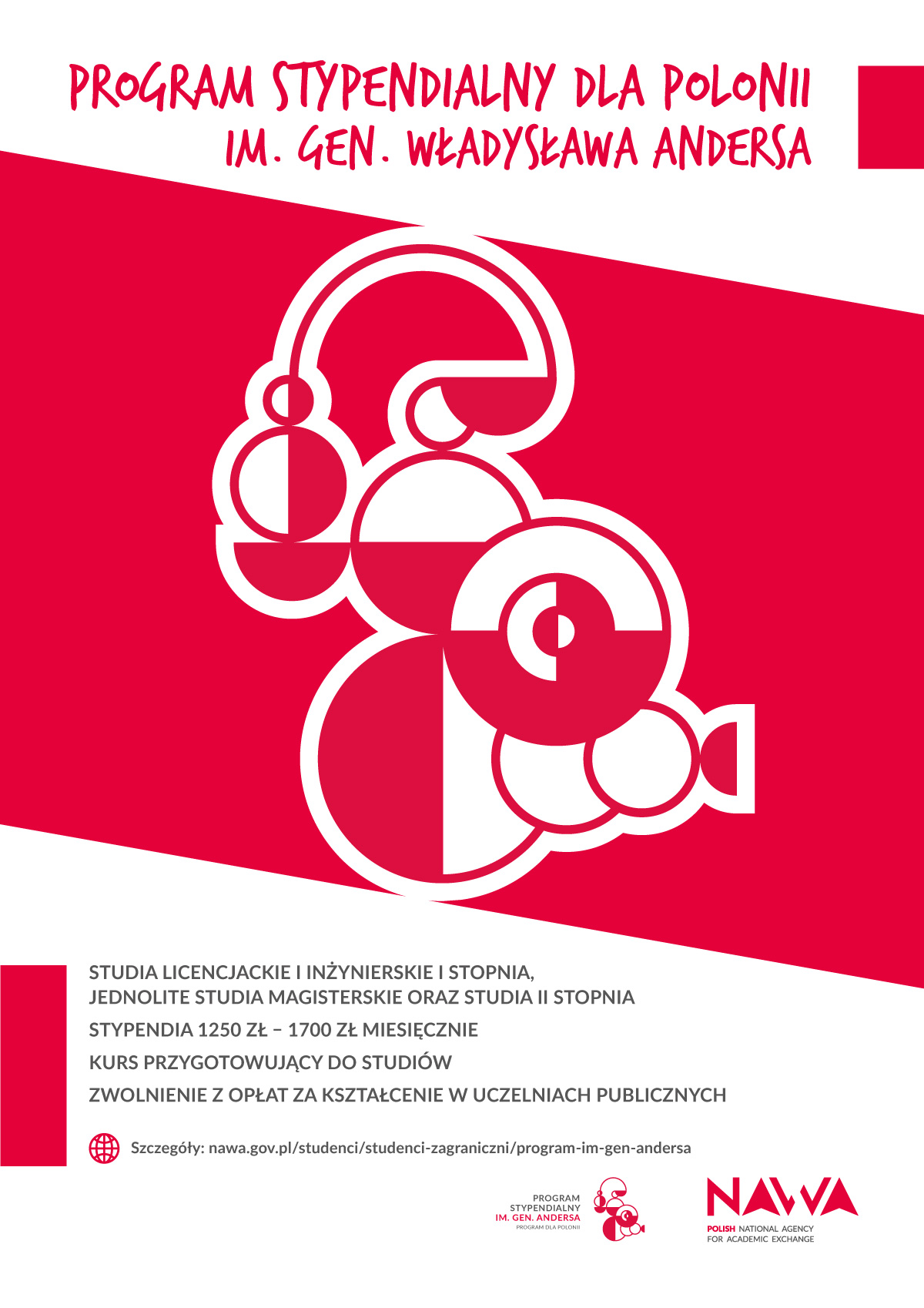 Narodowa Agencja Wymiany Akademickiej uruchomiła nabory wniosków w Programie stypendialnym dla Polonii im. gen. Władysława Andersa – studia I stopnia i studia jednolite magisterskie oraz w Programie stypendialnym dla Polonii im. gen. Władysława Andersa – studia II stopnia. Nabór wniosków prowadzony jest za pośrednictwem systemu teleinformatycznego NAWA (link: https://programs.nawa.gov.pl/login) do 16 marca 2020 r., do godz. 15.00.