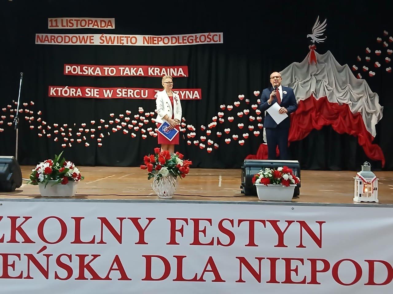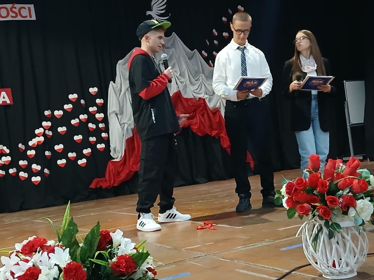 Licealiści zaprosili zgromadzonych do obejrzenia scenki z „mini studia telewizyjnego”, w którym goście: muzyk, poetka, nauczyciel, młodzież licealna i rodzic definiowali, czym właściwie jest dla nich Ojczyzna.