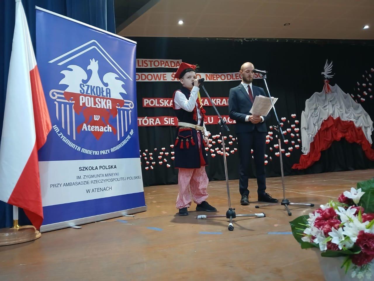 Radosne obchody Święta Niepodległości zgromadziły blisko 150 przedstawicieli Polonii, w tym uczniów, ich rodziny, grono pedagogiczne i przyjaciół Szkoły, reprezentantów polonijnego biznesu, Ambasady RP w Atenach oraz Polaków mieszkających w stolicy Grecji, którzy przybyli do Centrum Kultury „Elliniko Moliwi”, by wspólnie świętować 106. rocznicę odzyskania niepodległości przez Polskę.