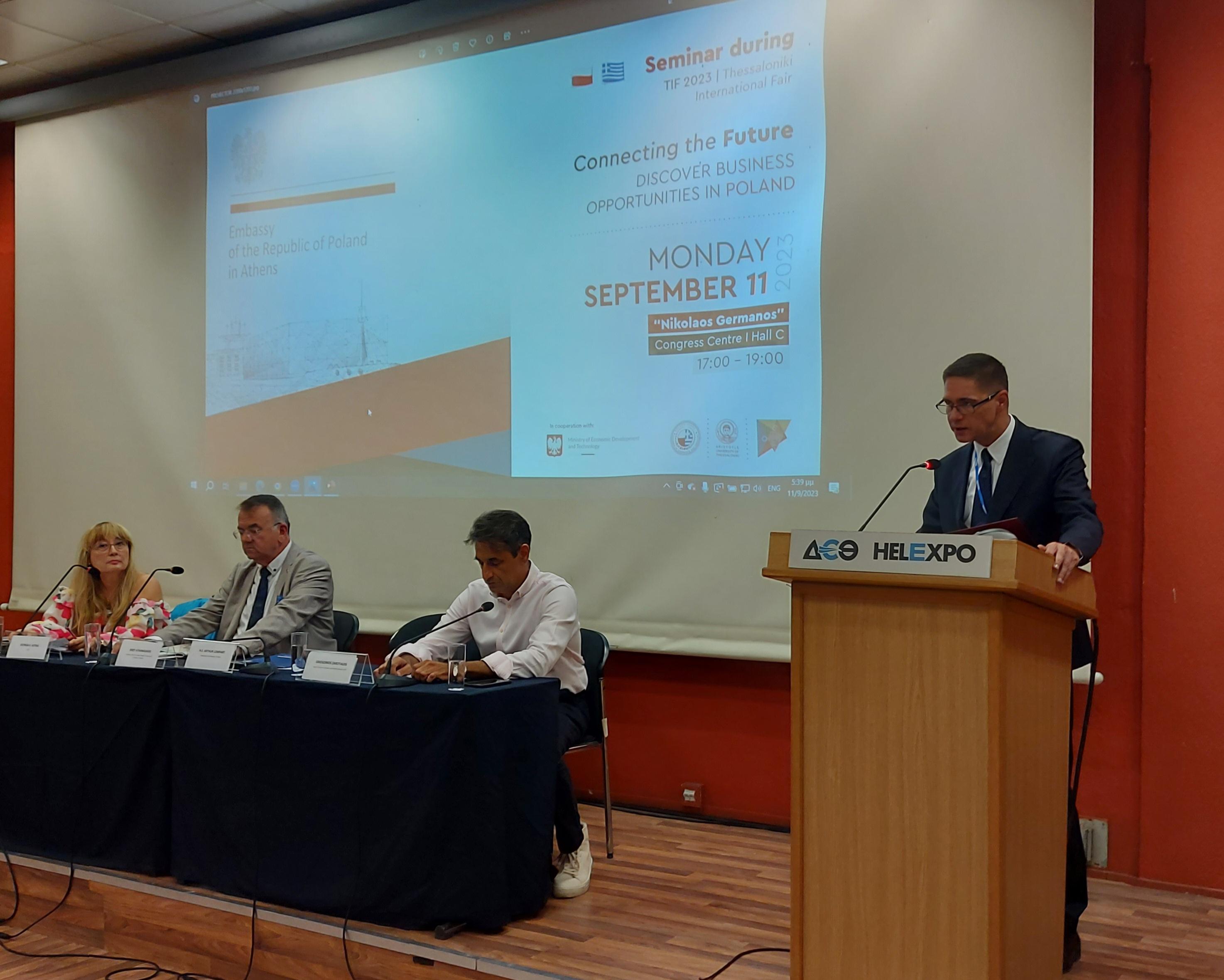 Na marginesie targów TIF Ambasada RP w Atenach we współpracy z Polsko-Grecką Izbą Przemysłowo-Handlową i Wydziałem Ekonomicznym Uniwersytetu Arystotelesa w Salonikach zorganizowała seminarium nt. perspektyw polsko-greckiej współpracy w zakresie zielonych technologii i inteligentnych rozwiązań w oparciu o Inicjatywę Trójmorza, zatytułowane „Connecting the Future: Discover business opportunities in Poland”. Seminarium miało na celu zaprezentowanie potencjału polskiej branży zielonych technologii i inteligentnych rozwiązań oraz szczegółowej promocji ofert polskich przedsiębiorstw obecnych na targach TIF 2023. Przybliżyło także greckiemu odbiorcy kwestię potencjału i dynamiki rozwoju Inicjatywy Trójmorza, w szczególności w kontekście obecnych wyzwań geopolitycznych. Wystąpienie otwierające wygłosił ambasador Artur Lompart, w którym odniósł się do przystąpienia Grecji do Inicjatywy Trójmorza podczas Szczytu Trójmorza i Forum Biznesu w Bukareszcie w dniu 6-7.09 i możliwości współpracy z Polską w ramach tej inicjatywy. W panelu poświęconym możliwościom współpracy portowej i transportowej w oparciu o inicjatywę Via Carpatia kontekst geoekonomiczny i geopolityczny inicjatywy przybliżył prof. Grigoris Zarotiadis, Dziekan Wydziału Ekonomicznego Uniwersytetu Arystotelesa w Salonikach. Następnie ofertę i potencjał współpracy przedstawiły porty w Gdańsku i Gdyni. Ten pierwszy reprezentował Prezes Zarządu Port Gdański Eksploatacja, Mariusz Wdowczyk, drugi – manager projektu, Michał Tuszyński. Panel biznesowy otworzyła Aleksandra Wadowska, Kierownik w Departamencie Wsparcia Przedsiębiorczości Polskiej Agencji Rozwoju Przedsiębiorczości, przedstawiając potencjał polskiej gospodarki i możliwości współpracy polsko-greckiej, do której odniósł się następnie prezes Izby Jerzy Athanasiadis. Po części ogólnej ofertę przedstawiły firmy SEEDIA i HydrogenUtopia. Po sesji prezentacyjnej uczestnicy seminarium mieli okazję do nawiązania bezpośrednich kontaktów i kontynuacji rozmów podczas sesji networkingowej. Informacja o seminarium została rozpropagowana na stronie internetowej i w mediach społecznościowych organizatora targów TIF-HELEXPO.