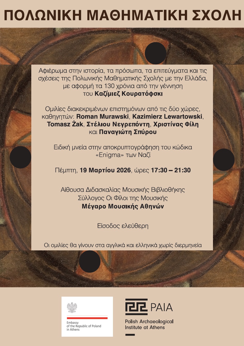 W 130. rocznicę urodzin profesora Kazimierza Kuratowskiego, Ambasada RP w Atenach we współpracy z Polskim Instytutem Archeologicznym w Atenach zorganizowała 19 marca 2026 r. seminarium poświęcone historii Polskiej Szkoły Matematycznej - jednego z najważniejszych i najbardziej inspirujących rozdziałów w dziejach nauki XX wieku.