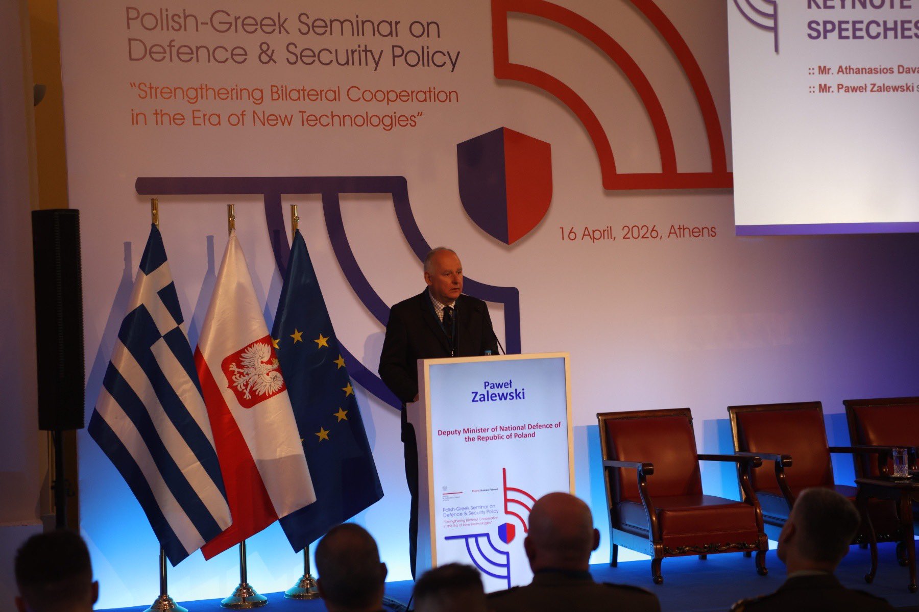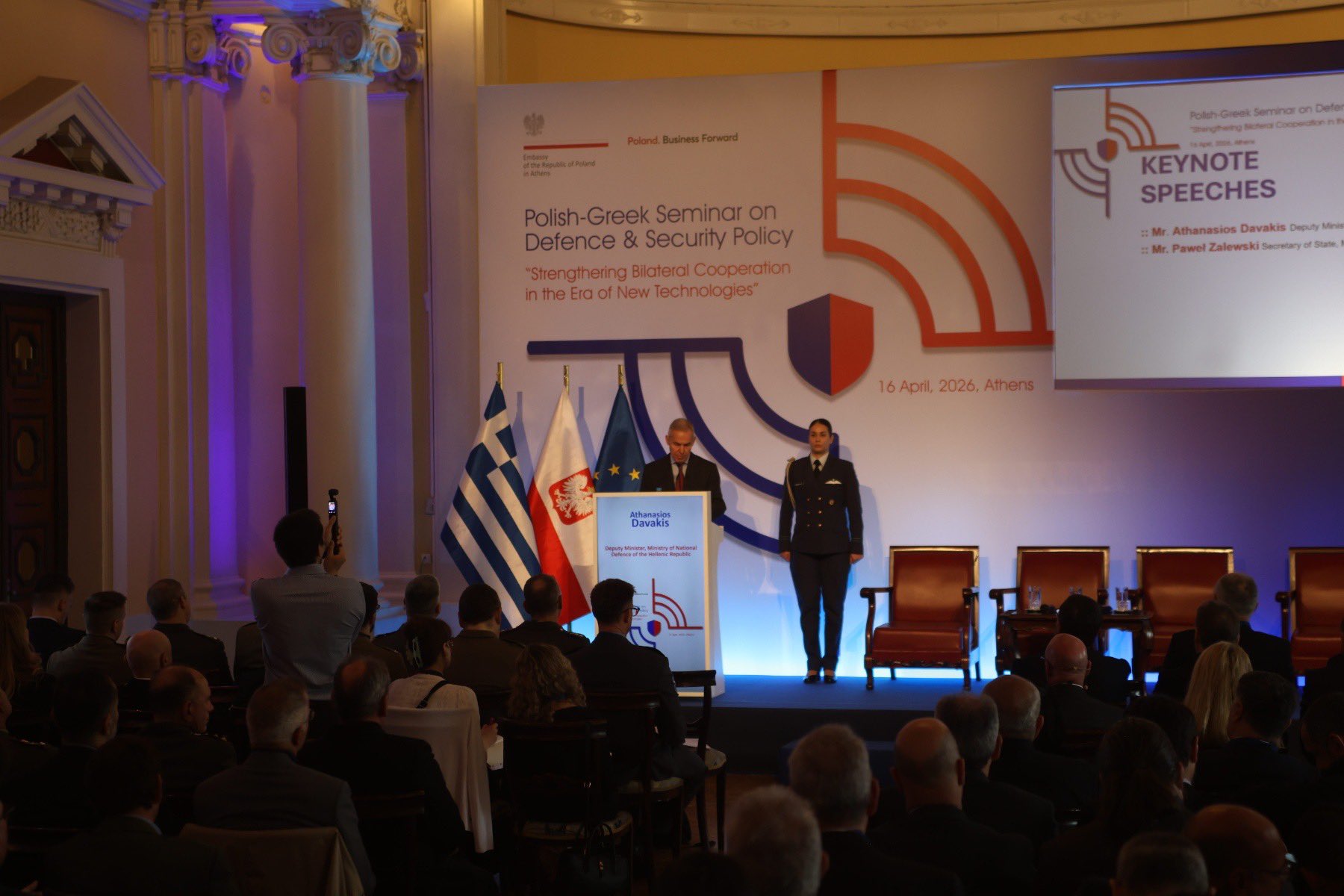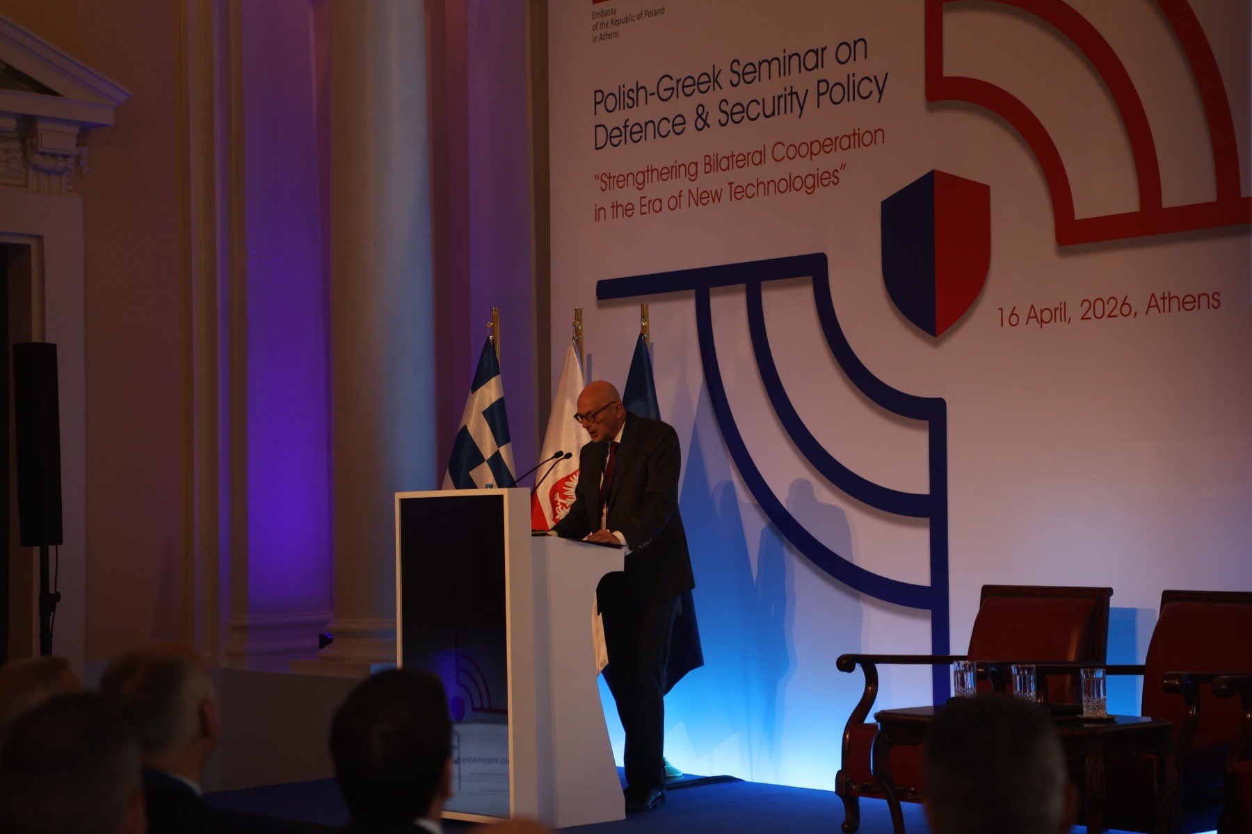 Ambasada RP w Atenach zorganizowała 16.04.2026 r. polsko-greckie seminarium pt. „Strengthening Bilateral Cooperation in the Era of New Technologies”, którego celem było wzmocnienie współpracy strategicznej poprzez integrację wiedzy ekspertów sektora publicznego i prywatnego obu państw oraz rozwój nowoczesnego europejskiego filaru obrony.
