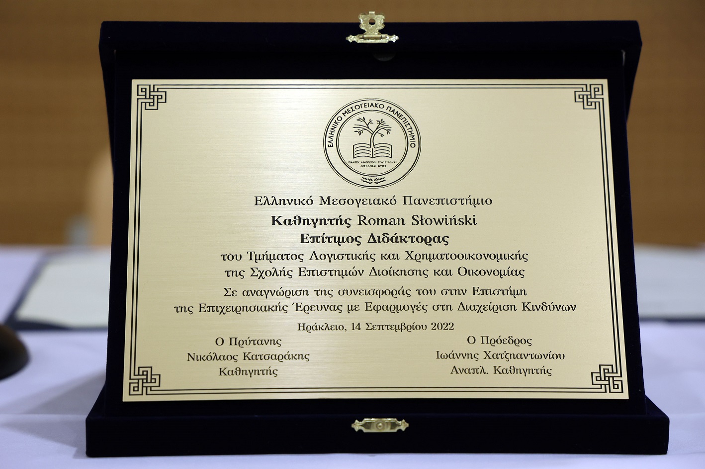 14 września w auli Greckiego Uniwersytetu Śródziemnomorskiego w Heraklionie na Krecie miała miejsce ceremonia nadania profesorowi Romanowi Słowińskiemu godności doktora honoris causa Katedry Rachunkowości i Finansów Wydziału Zarządzania i Nauk Ekonomicznych w uznaniu zasług w dziedzinie badań operacyjnych nad inteligentnym wspomaganiem decyzji.