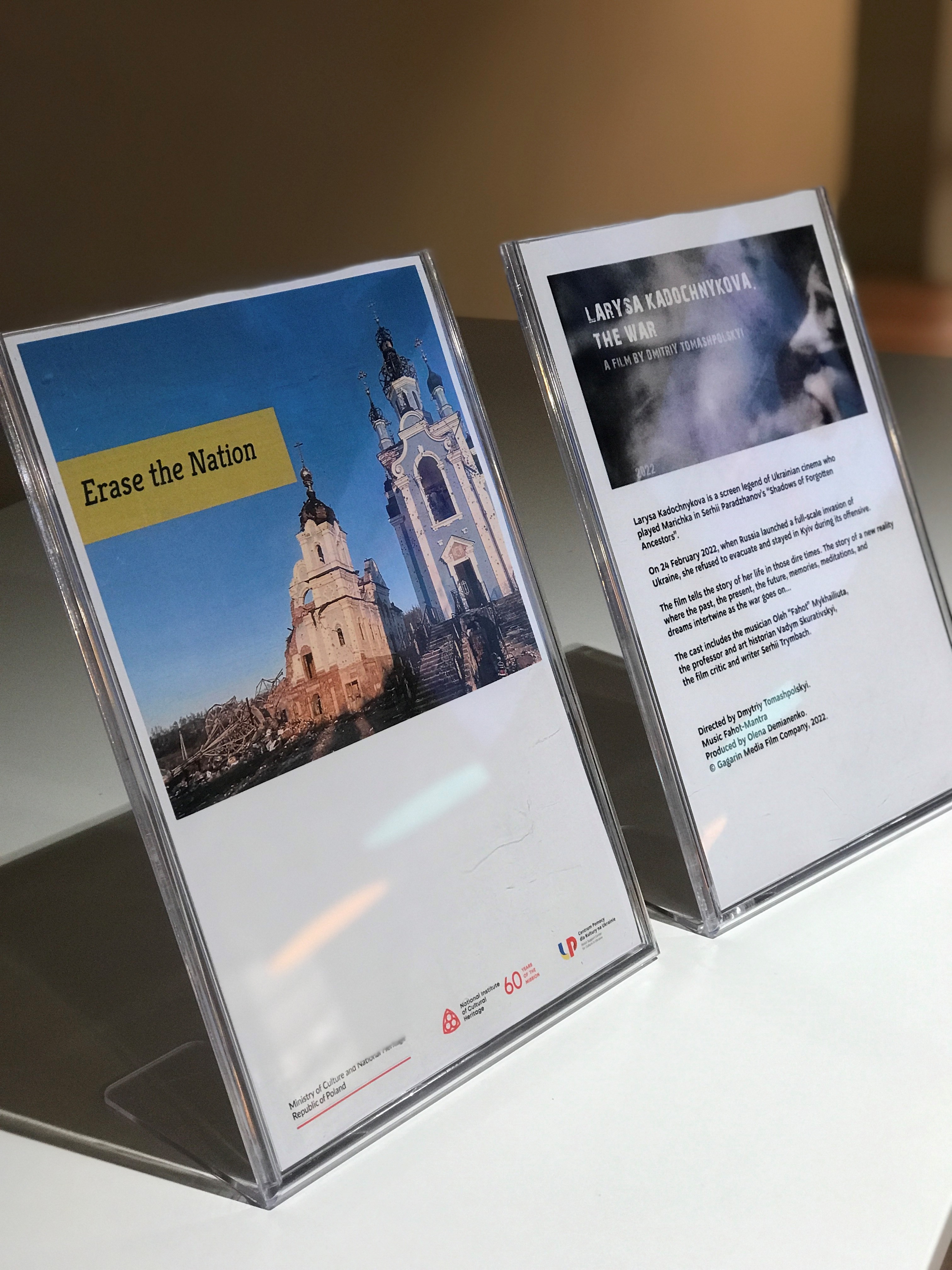 Oba zaprezentowane filmy krótkometrażowe, choć różniące się od siebie sposobem realizacji oraz ujęcia tematu, podnoszą kwestię zagrożenia, jakie stanowią systematyczne ataki strony rosyjskiej na ukraińskie obiekty dziedzictwa kulturowego. Film polskiego dziennikarza wojennego i reżysera T. Grzywaczewskiego „Wymazać Naród” obrazuje ogrom zniszczeń obiektów zarówno ze sfery kultury świeckiej, jak i sakralnej. Atakom poddawane są zabytki archeologiczne, biblioteki czy szkoły – w dokumencie ukazano zniszczenia dokonane w takich miastach jak Czernihów, Iwanków, Kijów, Charków, Izium i Bohorodyczne. Z kolei film ukraińskiego reżysera, Dimitrija Tomaszpolskiego, pt. „Larysa Kadochnykova. Wojna” w artystycznym ujęciu opowiada historię znanej i lubianej w Ukrainie aktorki pochodzenia rosyjskiego, Larysy Kadochnykovej, która po rozpoczęciu pełnoskalowej inwazji Rosjan na Ukrainę zdecydowała się pozostać w ukochanym Kijowie. Film koncentruje się na wybranych aspektach życia codziennego aktorki w warunkach nieustannego zagrożenia atakami Rosjan i dotyka problemu utrudnionego dostępu do kultury wysokiej w czasach wojny oraz wyzwań związanych z kontynuacją działań twórczych ukraińskich artystów.