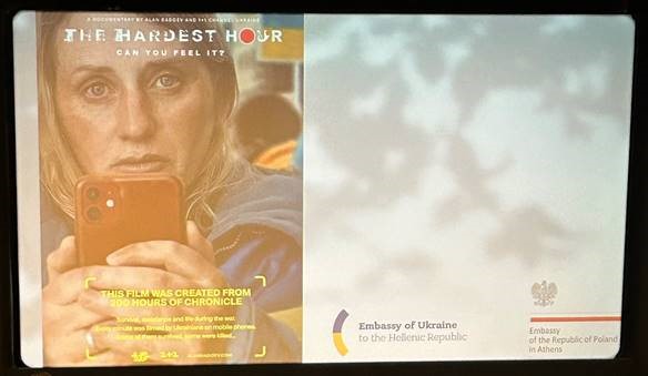 Celem podkreślenia 2 lat od wybuchu pełnoskalowej wojny na Ukrainie Ambasada RP w Atenach wspólnie z Ambasadą Ukrainy zorganizowała 5 marca 2024 r. projekcję filmu dokumentalnego ukraińskiego reżysera Alana Badoeva pt. „The Hardest Hour. Can you feel it?”