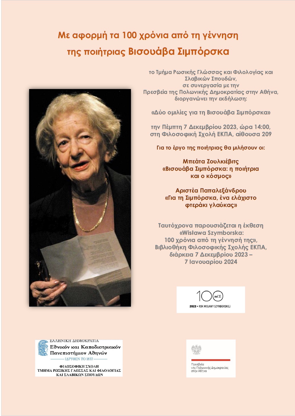Z okazji 100 rocznicy urodzin polskiej poetki, laureatki literackiej Nagrody Nobla, Ambasada RP przy współpracy ze Szkołą Filozoficzną Uniwersytetu Ateńskiego organizują 7 grudnia wydarzenie poświęcone życiu i twórczości Wisławy Szymborskiej.