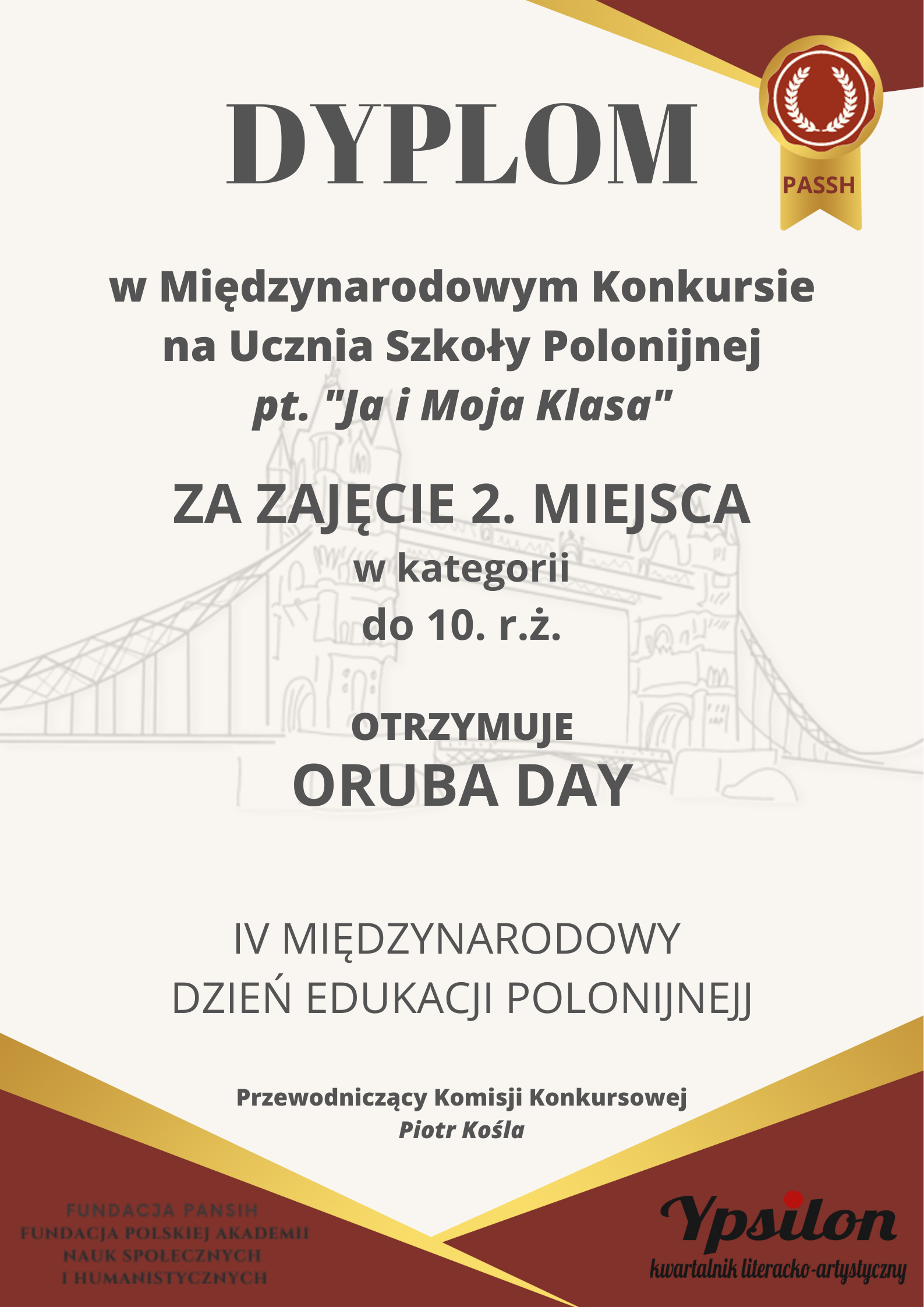 Miło nam poinformować, że Oruba Day, uczennica czwartej klasy Szkoły Polskiej przy Ambasadzie RP w Atenach z siedzibą w Heraklionie zajęła II miejsce w „Międzynarodowym Konkursie na Ucznia Roku 2022/2023 Szkoły Polonijnej” pt.: „Ja i Moja Klasa”.