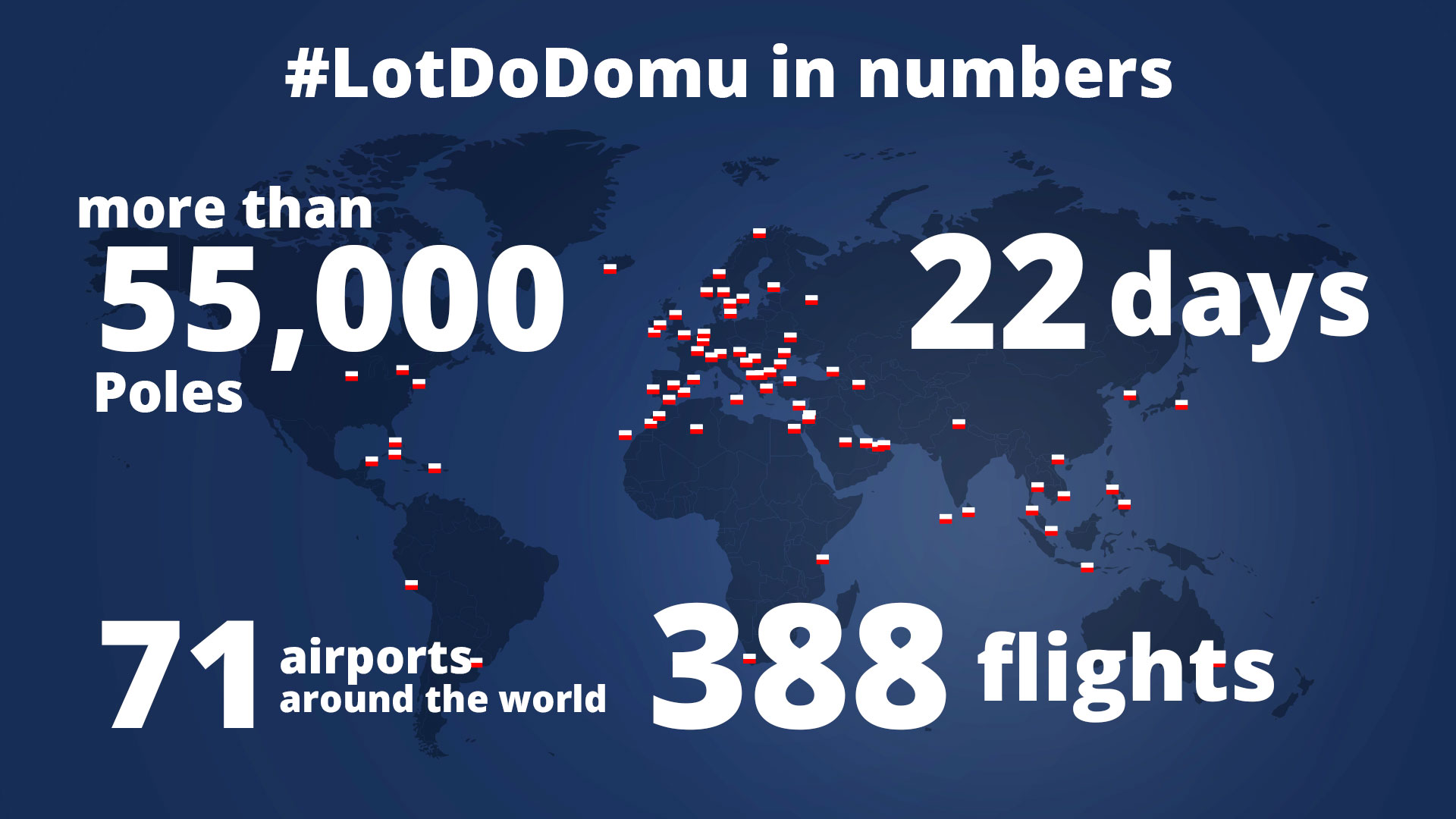 After three weeks of intense efforts to return Polish citizens to their homeland, the #LOTdoDomu programme was completed on Sunday, 5 April 2020. As part of this initiative, in just 22 days, the Polish LOT airlines organised 388 special charter flights which brought over 55,000 people safely home.
