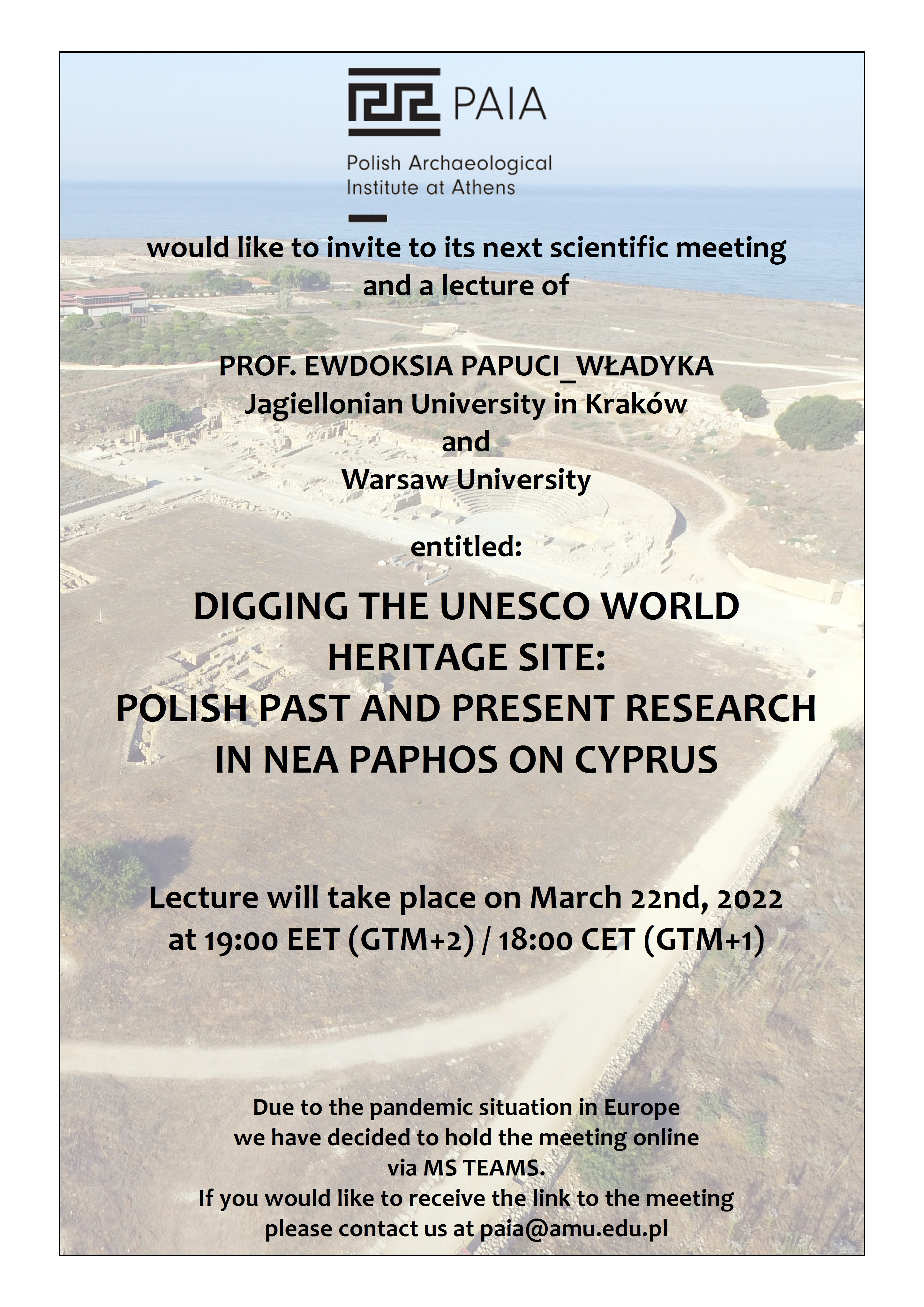 PAIA invites for the next on-line lecture “Digging the UNESCO World Heritage Site: Polish past and present research in Nea Paphos on Cyprus” by Prof. Ewdoksia Papuci-Władyka from Jagiellonian University in Kraków and University of Warsaw.