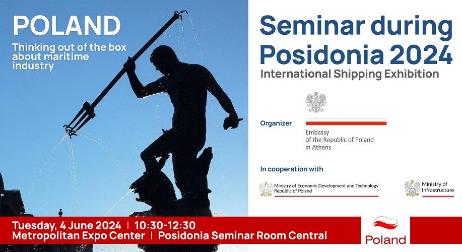 The Embassy of the Republic of Poland in Athens kindly invites you to the 3rd Seminar “POLAND – Thinking out of the box about maritime industry” that will take place on Tuesday, June 4th, 2024 between 10.30 and 12.30 during Posidonia 2024 International Shipping Exhibition at the Metropolitan Expo Center (Posidonia Seminar Room Central).
