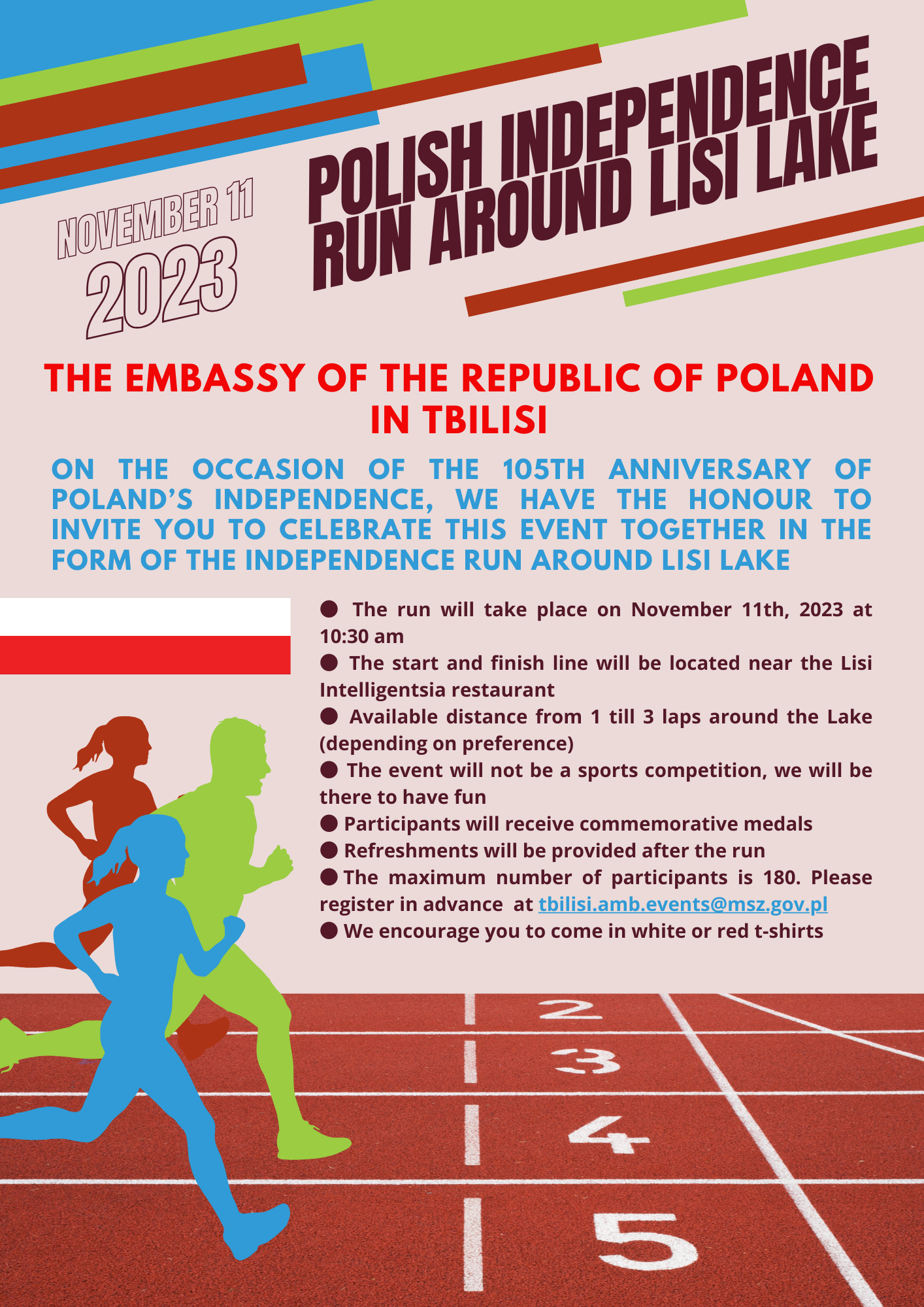 Ambasada RP w Tbilisi ma zaszczyt zaprosić Państwa do udziału w Biegu Niepodległości zorganizowanym z okazji 105. rocznicy odzyskania przez Polskę suwerenności po 123 latach zaborów.