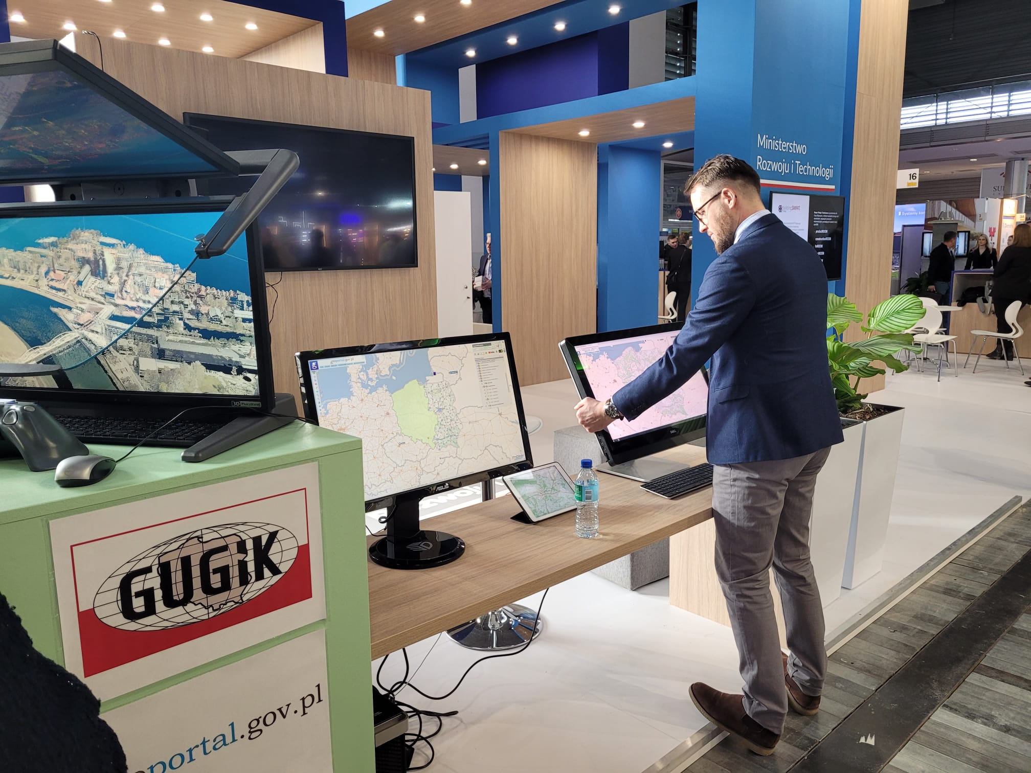 Uroczystym otwarciem 31.01.2023 r. rozpoczęły się określane jako „wielkie święto branży budowlanej” targi BUDMA i WinDoor-tech. W wydarzeniu, które otworzył Wiceminister Rozwoju i Technologii i Rozwoju, Sekretarz Stanu Piotr Uściński uczestniczyła p.o. Główny Geodeta Kraju Alicja Kulka, a także inni znakomici goście: Prezydent Poznania Jacek Jaśkowiak, Starosta Poznański Jan Grabkowski i Wicemarszałek Województwa Wielkopolskiego Wojciech Jankowiak. Główny Urząd Geodezji i Kartografii przez 4 dni targów (31.01.2023 r. – 03.02.2021 r.) prezentuje na nagrodzonym przez targi BUDMA stoisku Ministerstwa Rozwoju i Technologii m.in.wykorzystanie otwartych danych przestrzennych w serwisie geoportal.gov.pl, rzeczywistość 3D i ASG-EUPOS. Odwiedzającego stoisko Wiceministrowi Rozwoju i Technologii Piotra Uścińskiego szczególnie zainteresował prezentowany monitor 3D, dzięki któremu można przegladać dane GUGiK (zdjęcia lotnicze i chmurę punktów) w tej technologii. Oprócz stoisk wielu wystawców podczas targów zaplanowane jest wiele profesjonalnych prezentacji branżowych. Szczegółowy plan wydarzeń można odnaleźć tutaj: https://budma.pl/pl/zwiedzajacy/program-wydarzen/program-wydarzen-targow-budma-2023