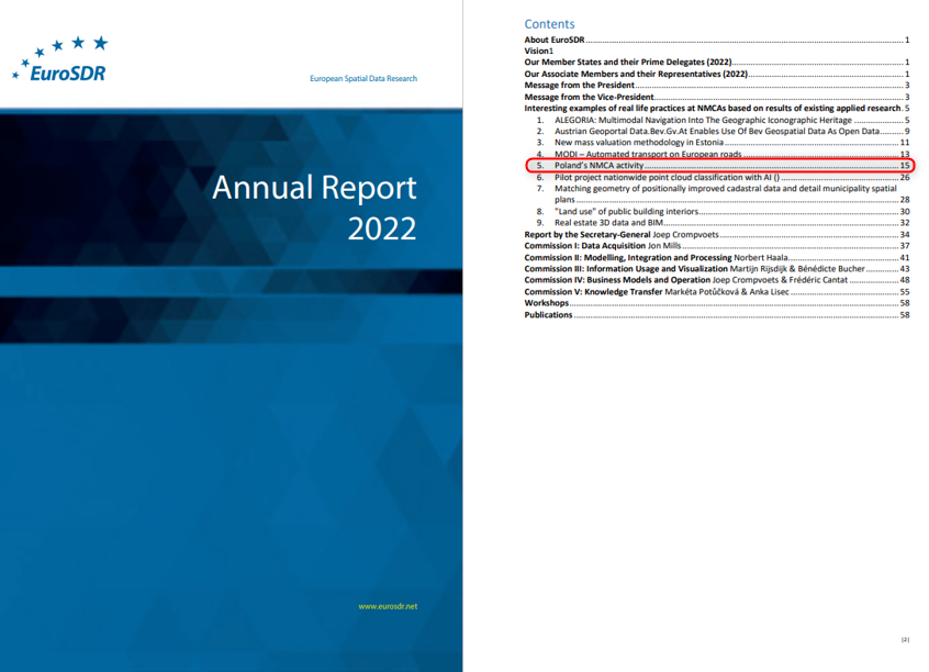 O działaniach podejmowanych przez Główny Urząd Geodezji i Kartografii w 2022 roku można przeczytać w Raporcie Rocznym 2022 EuroSDR . EuroSDR jest ogólnoeuropejską organizacją zrzeszającą agencje kartograficzne, jednostki naukowo-badawcze, przemysł, sektor prywatny oraz użytkowników związanych z wdrażaniem rozwoju technologicznego w zakresie informacji przestrzennej. Członkiem EuroSDR ze strony Polski jest Główny Urząd Geodezji i Kartografii oraz Politechnika Warszawska.