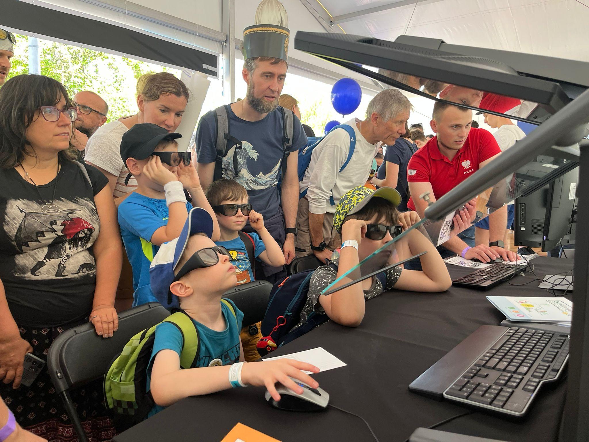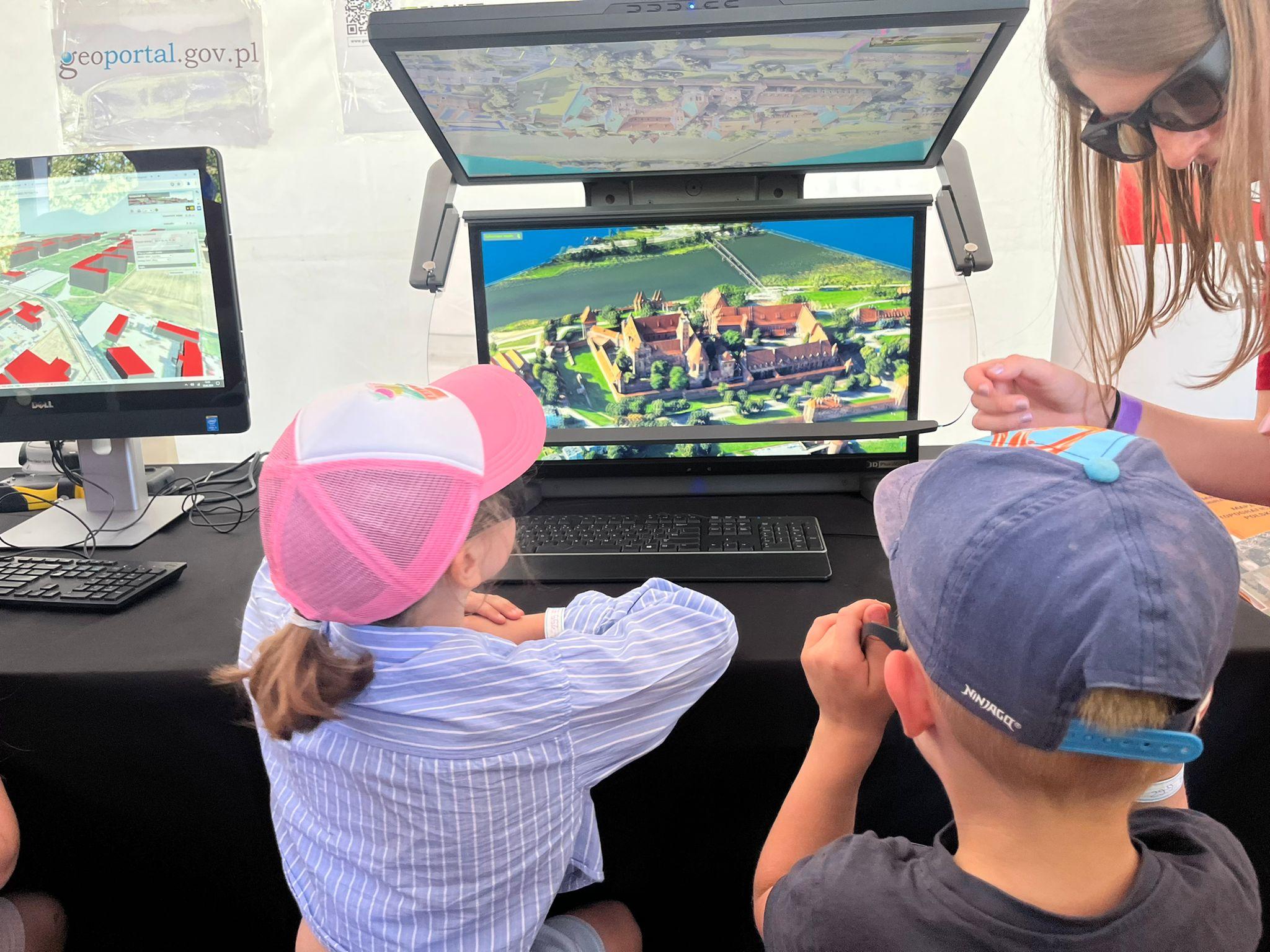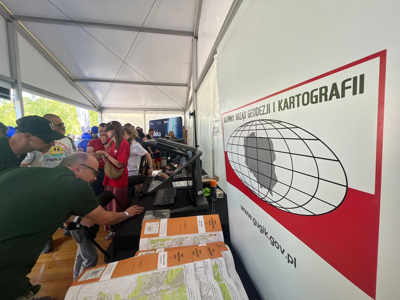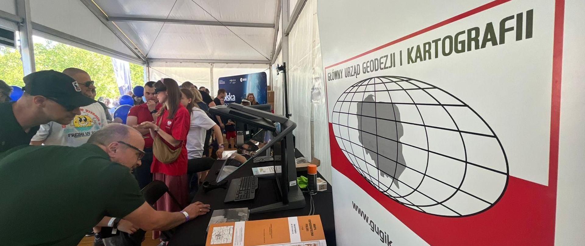Prezentacja GUGiK na 27. Pikniku Naukowym Polskiego Radia i Centrum Nauki Kopernik była jedną z najczęściej odwiedzanych atrakcji. Na Stadionie PGE Narodowy 15 czerwca 2024 r. w stoisku Ministerstwa Rozwoju i Technologii prezentowaliśmy przede wszystkim cyfrową stację fotogrametryczną - wysokiej klasy komputer wraz ze specjalistycznym monitorem, okularami oraz myszką 3D. Zestaw wraz oprogramowaniem, umożliwia budowę modeli stereoskopowych ze zdjęć lotniczych i wykonywanie pomiarów w przestrzeni trójwymiarowej, co sprowadza się do prowadzenia przez obserwatora znaczka pomiarowego po modelu stereoskopowym na określonej wysokości tak, aby cały czas „dotykał” mierzonego obiektu. W ten sposób wykonywany jest pomiar i wnoszone są na mapę obiekty terenowe: punkty wysokościowe, obrysy budynków, drogi, chodniki, ogrodzenia, granice działek, słupy, włazy, studnie i inne obiekty widoczne na zdjęciach.