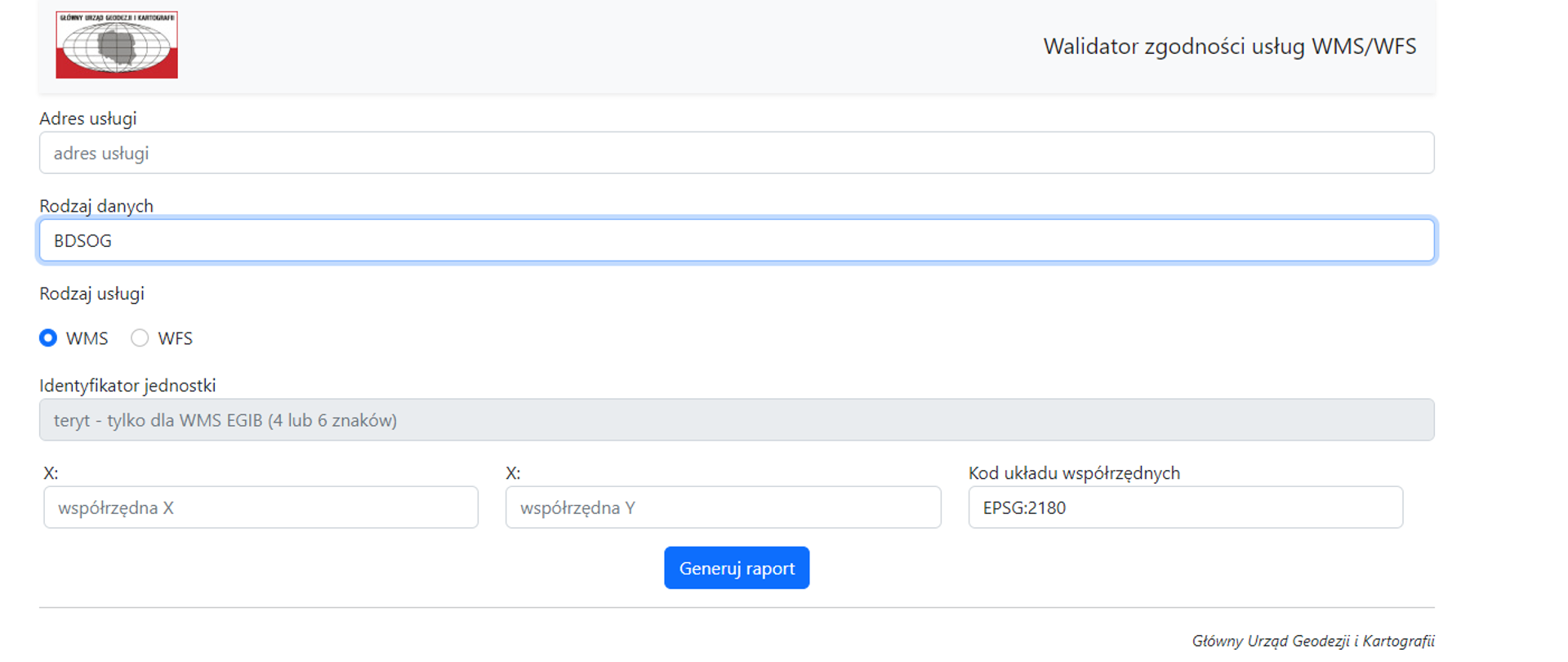 Zadaniem walidatora jest sprawdzanie zgodności usług z obowiązującymi przepisami prawa. Po wpisaniu adresu usługi WMS, wybraniu jej rodzaju oraz po podaniu współrzędnych X,Y oraz kodu układu współrzędnych punktu osnowy szczegółowej, generowany jest raport w postaci pliku PDF.