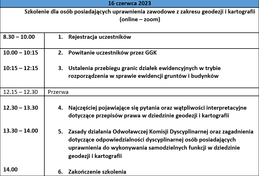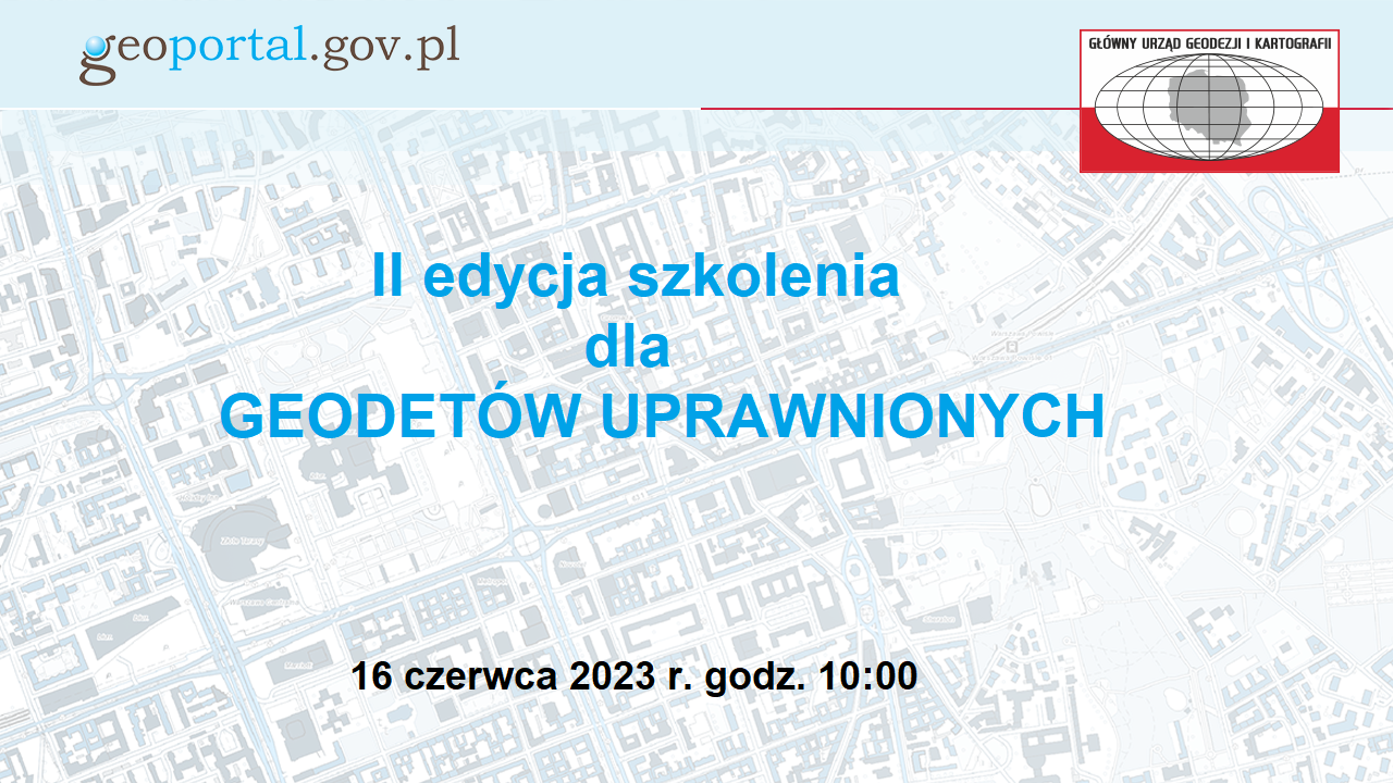 Alicja Kulka, p.o. Główny Geodeta Kraju zaprasza geodetów uprawnionych na II edycję bezpłatnego szkolenia, które jest w dużej mierze odpowiedzią na liczne pytania i wątpliwości kierowane do Głównego Urzędu Geodezji i Kartografii. Podczas szkolenia zostaną omówione również problemy związane z ustaleniem granic działek ewidencyjnych w trybie rozporządzenia w sprawie ewidencji gruntów i budynków. II edycja szkolenia odbędzie się 16 czerwca 2023 r. o godz. 10:00 na platformie Zoom.