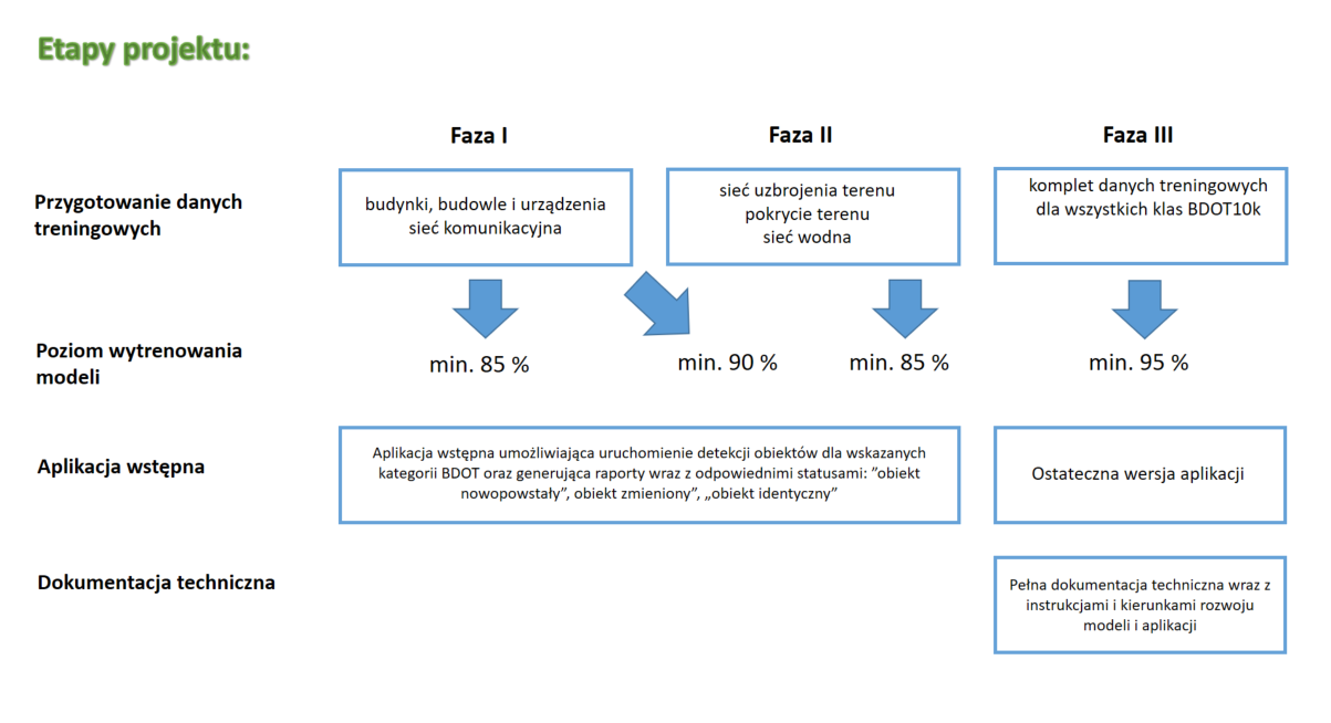 Celem projektu jest stworzenie narzędzi opartych na algorytmach uczenia maszynowego umożliwiających automatyczną detekcję obiektów topograficznych, które zasilają bazę BDOT10k. Automatyczna detekcja będzie oparta na danych fotogrametrycznych dostępnych w państwowym zasobie geodezyjnym i kartograficznym. W wyniku detekcji powstanie wykaz wykrytych obiektów topograficznych (w postaci pliku wektorowego obsługiwanego przez oprogramowanie GIS), sklasyfikowanych zgodnie ze specyfikacją BDOT10k. Wykryte obiekty będą porównane z aktualną bazą BDOT10k, a w wyniku zostanie im przypisany nowy atrybut „status”, zgodnie z poniższym: