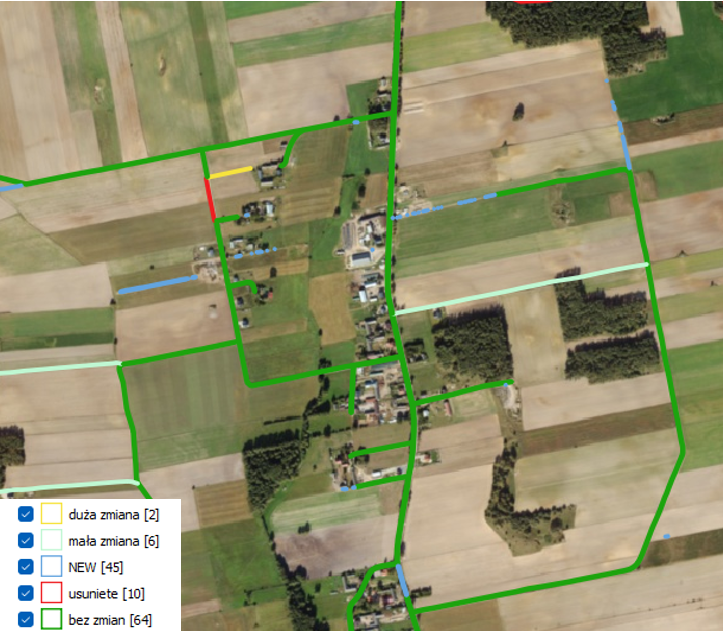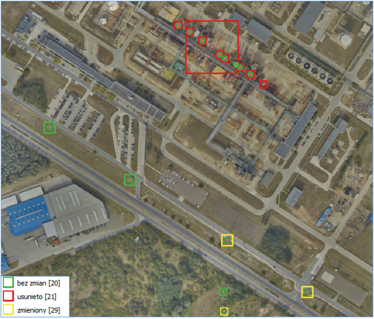 - „obiekt zmieniony”- geometria obiektu wykrytego różni się w stosunku do geometrii obiektu w bazie BDOT10k,