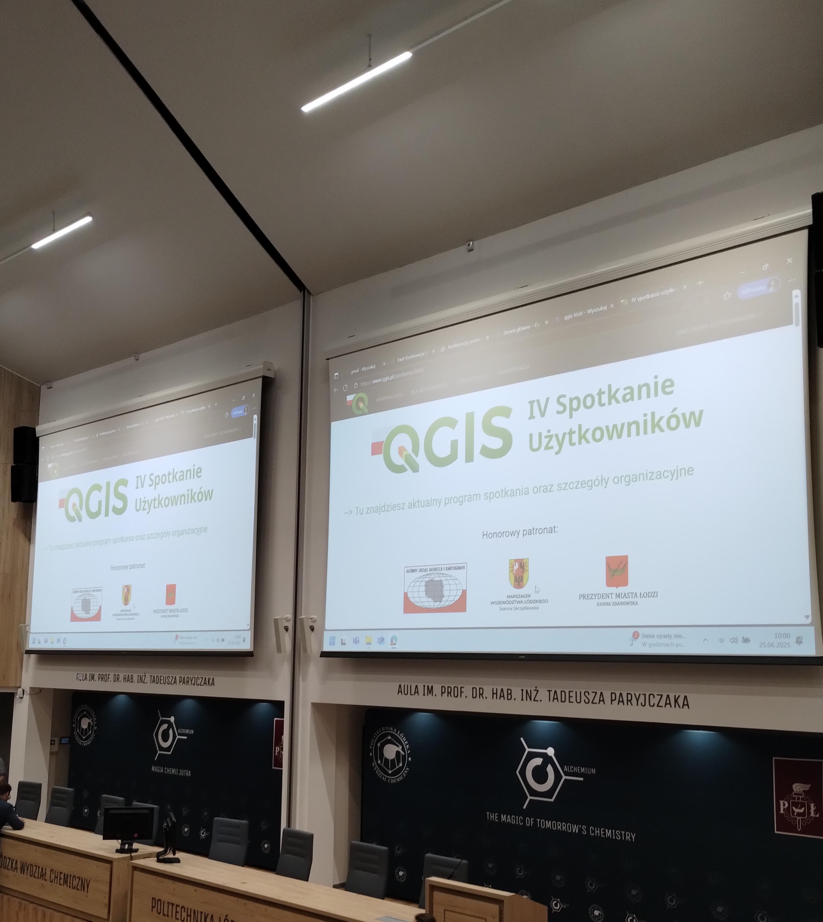 Pod honorowym patronatem Głównego Geodety Kraju 25 – 26 czerwca 2025 r. na Politechnice Łódzkiej odbyło się IV spotkanie użytkowników QGIS. Poświęcone było między innymi roli i znaczeniu danych przestrzennych oraz możliwościom ich przetwarzania przy wykorzystaniu darmowego oprogramowania QGIS.
