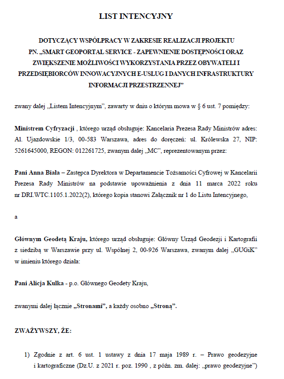 Alicja Kulka, p.o. Główny Geodeta Kraju, 4 stycznia 2023 r. podpisała list intencyjny dotyczący współpracy z Ministrem Cyfryzacji reprezentowanym przez Panią Annę Biała Zastępcę Dyrektora w Departamencie Tożsamości Cyfrowej w Kancelarii Prezesa Rady Ministrów, w zakresie realizacji projektu pn. „SMART GEOPORTAL SERVICE” - Zapewnienie dostępności oraz zwiększenie możliwości wykorzystania przez obywateli i przedsiębiorców innowacyjnych e-usług i danych Infrastruktury Informacji Przestrzennej.”