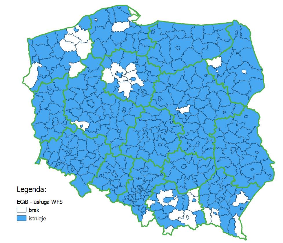Aktualnie już w siedmiu województwach tj.: łódzkim, lubelskim, dolnośląskim, lubuskim, opolskim, świętokrzyskim i warmińsko‑mazurskim wszystkie powiaty mają własne usługi WFS.