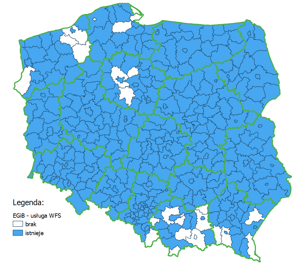 Aktualnie już w dziesięciu województwach tj.: mazowieckim, wielkopolskim, podlaskim, łódzkim, lubelskim, dolnośląskim, lubuskim, opolskim, świętokrzyskim i warmińsko‑mazurskim wszystkie powiaty mają własne usługi WFS.