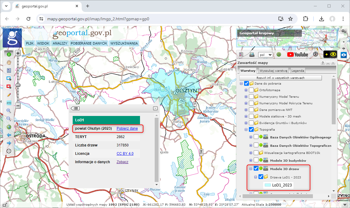 Modele 3D drzew są dostępne nieodpłatnie i do powszechnego wykorzystania za pomocą serwisu www.geoportal.gov.pl. W grupie warstw „Dane do pobrania” – „Topografia” widoczna jest usługa WMS „Modele 3D drzew” zawierająca warstwę „Drzewa LoD1 – 2023”. Wykorzystując narzędzie identyfikacji, po kliknięciu w oknie mapy w granicach powiatu, dla którego chcemy uzyskać dane, możemy pobrać modele 3D drzew.