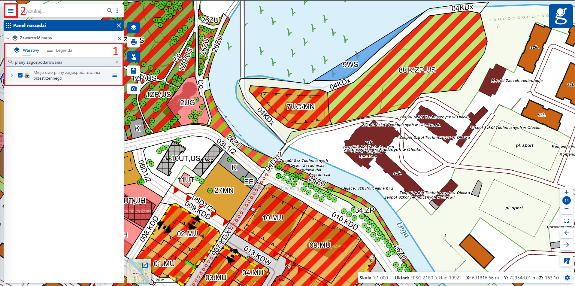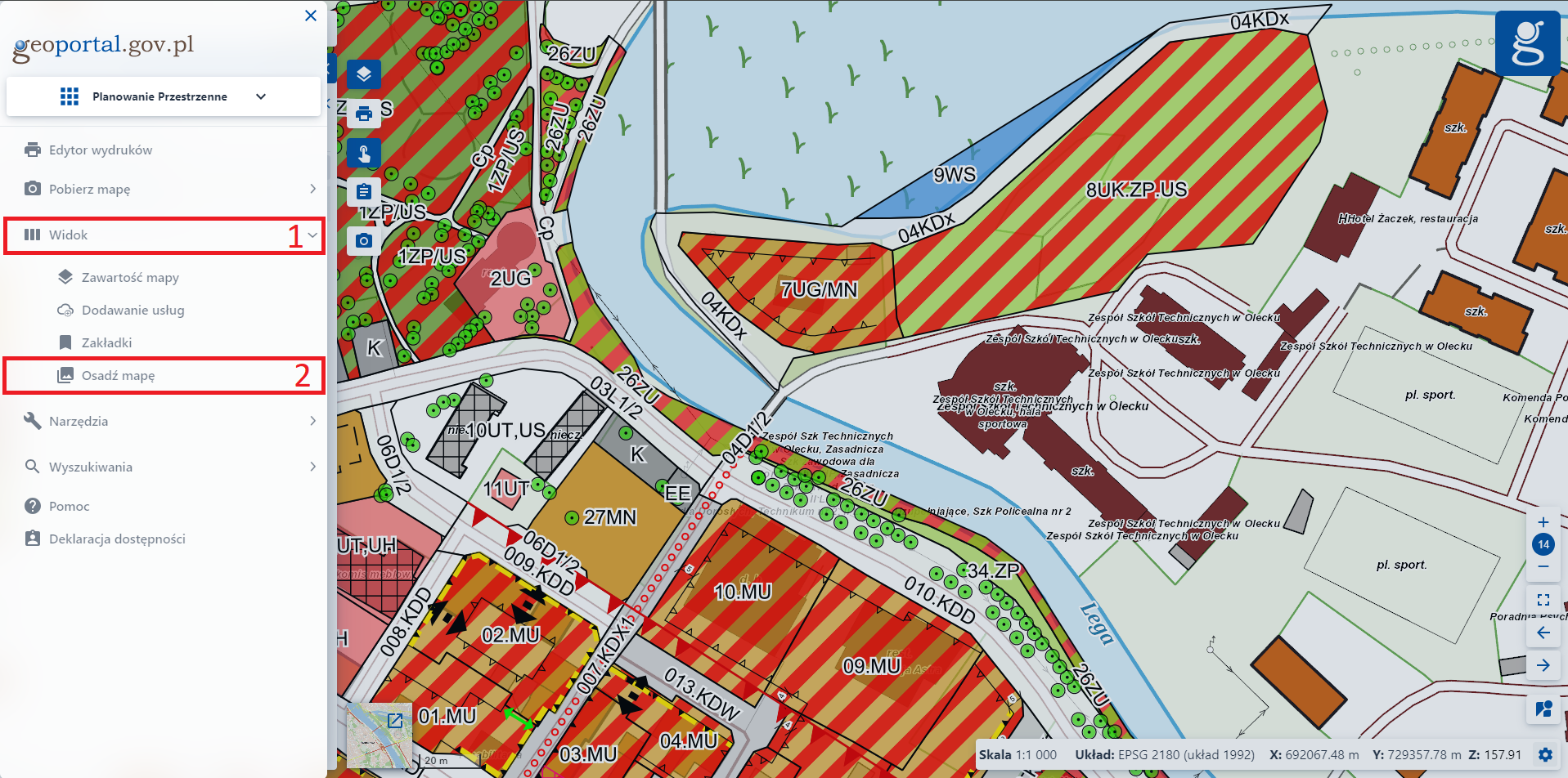 2. Przybliż mapę do poszukiwanego obszaru, a następnie wyszukaj i wybierz potrzebne warstwy i skonfiguruj swoją mapę według upodobań (np. zmień podkład mapowy, dodaj swoje szkice itp.), a następnie przejdź do menu.