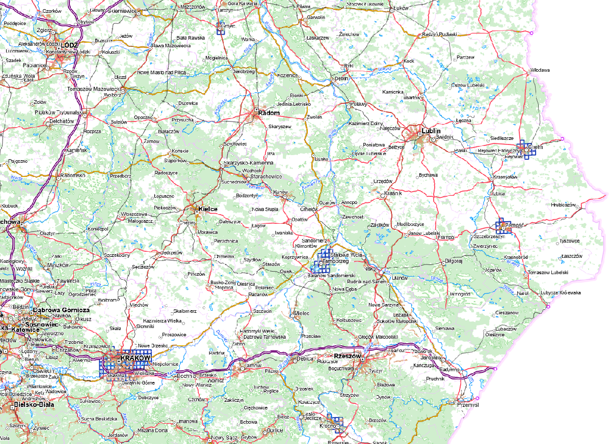 - dla miast: Chełm, Tarnobrzeg, Krosno, Kraków, Zamość, Grójec, Siedlce, o powierzchni około 979 km2, tj.: