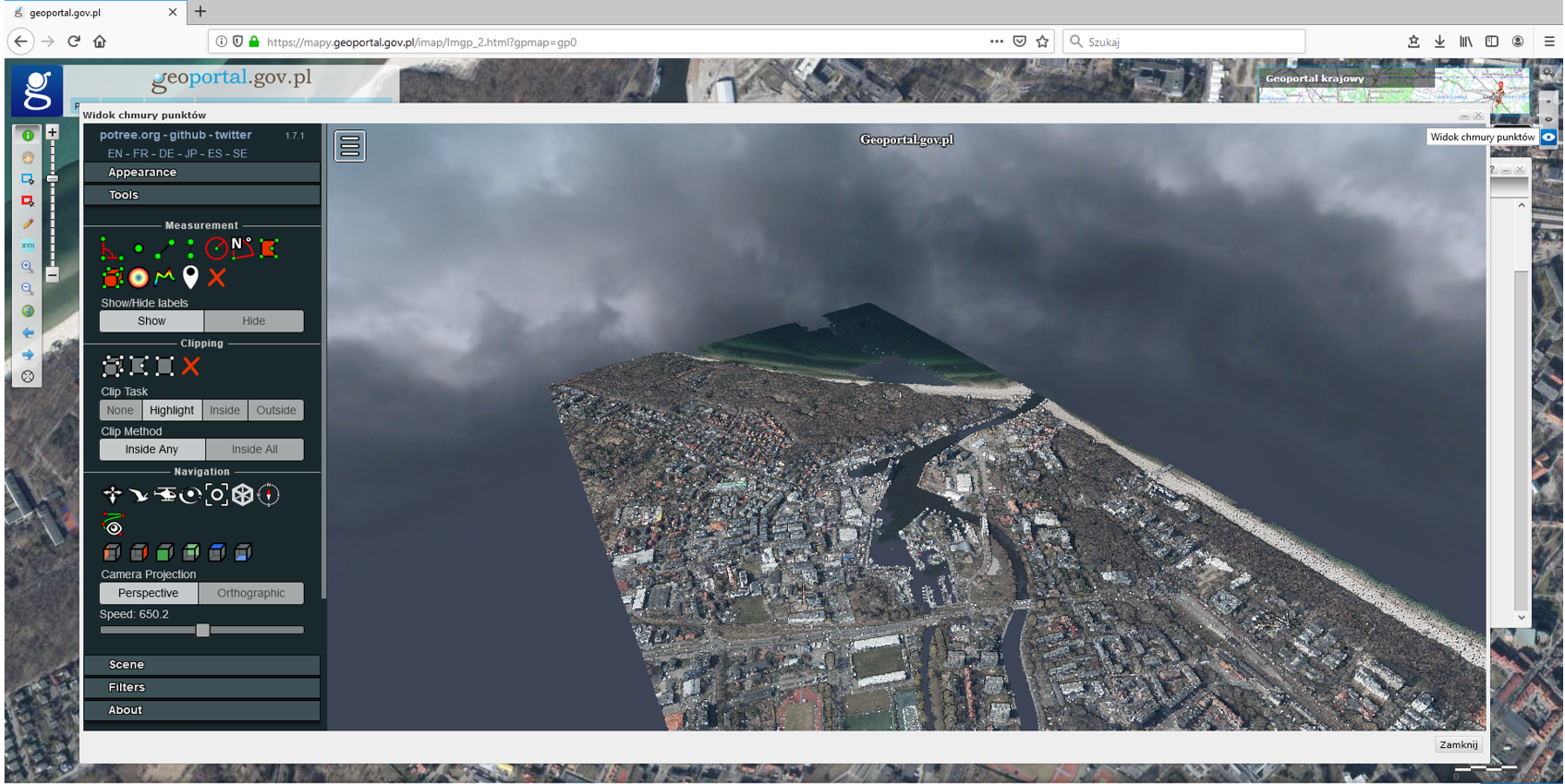 Chmurę punktów ALS można przeglądać w „Widoku chmury punktów”, w którym można również wykonać proste analizy na tych danych:
