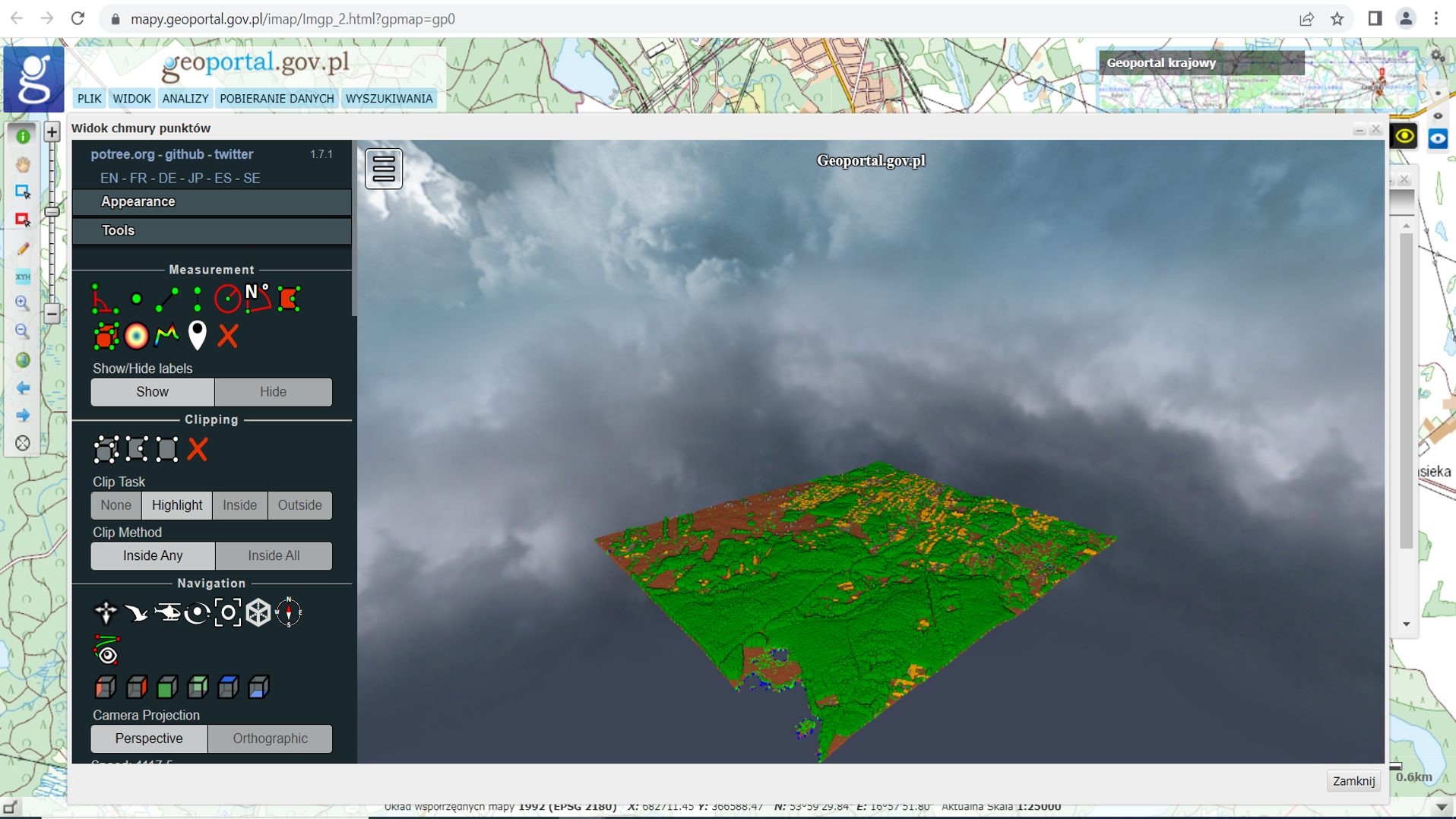 Chmurę punktów ALS można przeglądać w „Widoku chmury punktów”, w którym można również wykonać proste analizy na tych danych: