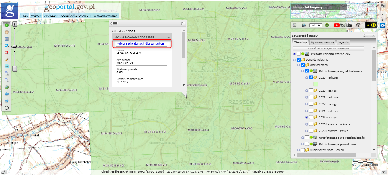 Wszystkie powyższe dane można pobrać bezpłatnie za pomocą skorowidzów dostępnych w serwisie www.geoportal.gov.pl w grupie warstw „Dane do pobrania” lub za pomocą usług pobierania WFS i WCS.