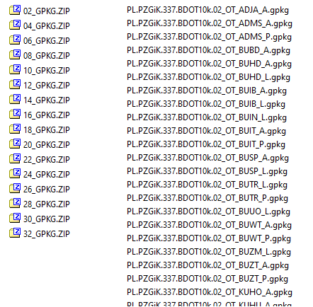 Dzięki takiemu pogrupowaniu danych, pobranie danych BDOT10k dla wybranego województwa, nie wymaga już pobierania kilkunastu lub kilkudziesięciu plików dotyczących każdego powiatu należącego do tego województwa oddzielnie. Z kolei pobranie danych dla całego kraju oznacza ‘rozpakowanie’ 16, a nie 380 osobnych plików .zip.