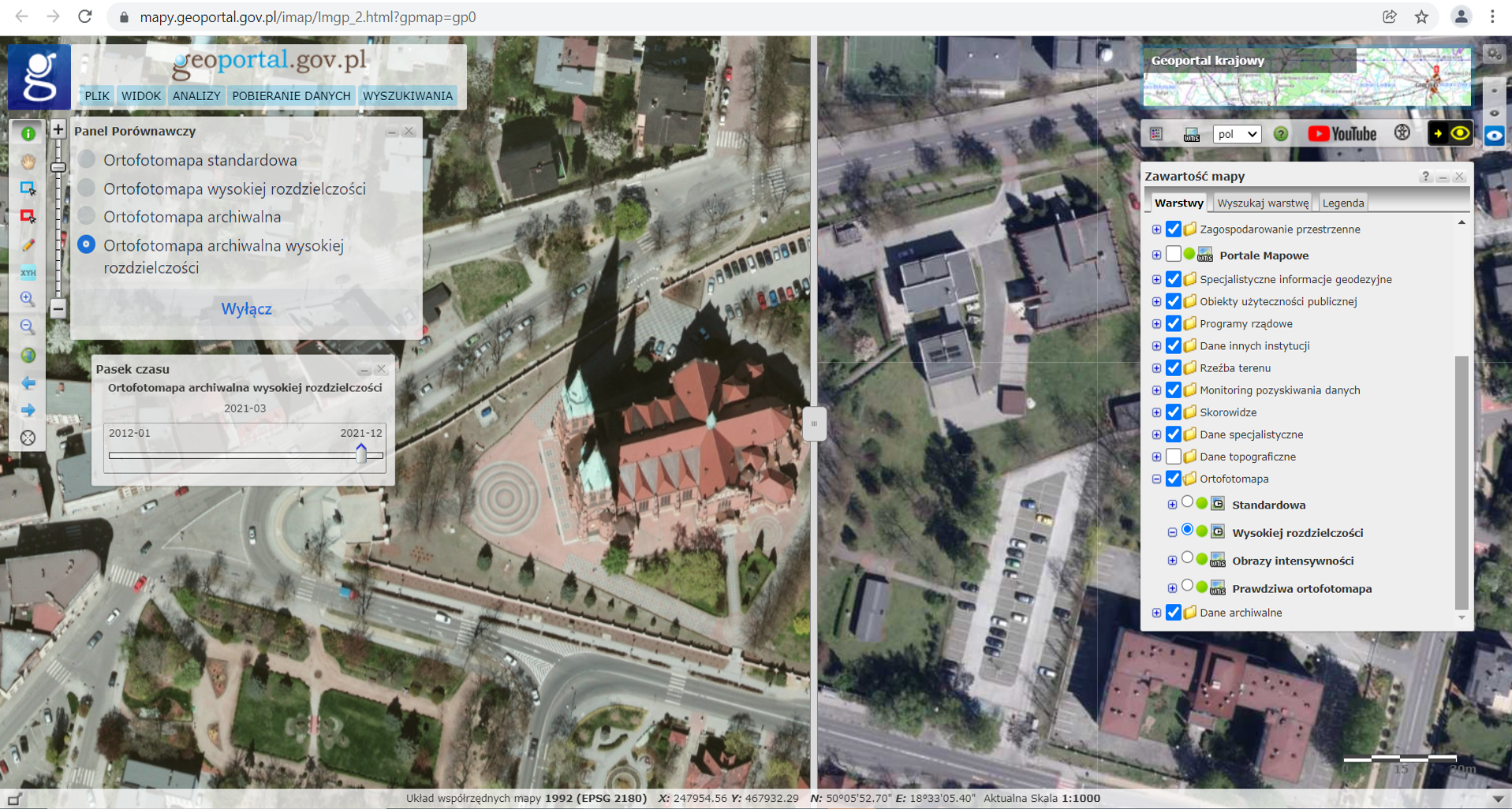 - ortofotomapy archiwalnej o wysokiej rozdzielczości, pod adresem: https://mapy.geoportal.gov.pl/wss/service/PZGIK/ORTO/WMS/HighResolutionTime