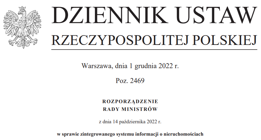 W Dzienniku Ustaw Rzeczpospolitej Polskiej z 1 grudnia 2022 roku zostało opublikowane Rozporządzenie Rady Ministrów z dnia 14 października 2022 r. w sprawie zintegrowanego systemu informacji o nieruchomościach (Dz. U. poz. 2469).