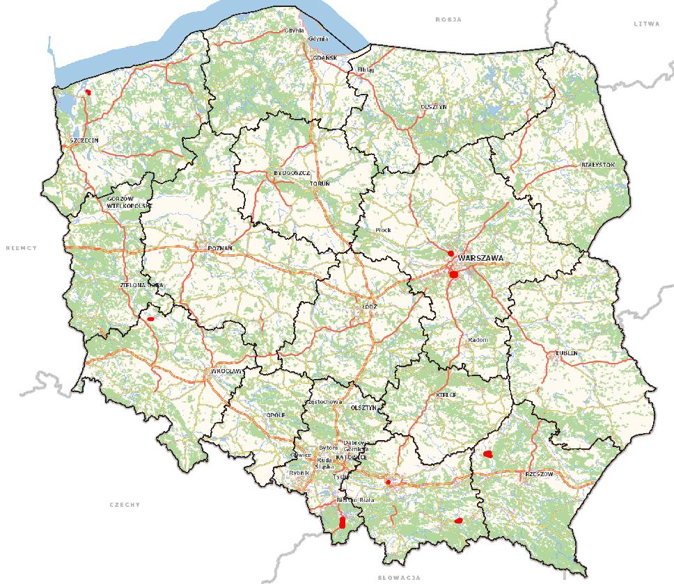 Na poniższej ilustracji kolorem czerwonym wskazano obszary, dla których dostępne są zeskanowane zdjęcia archiwalne wykonane na płytach szklanych.