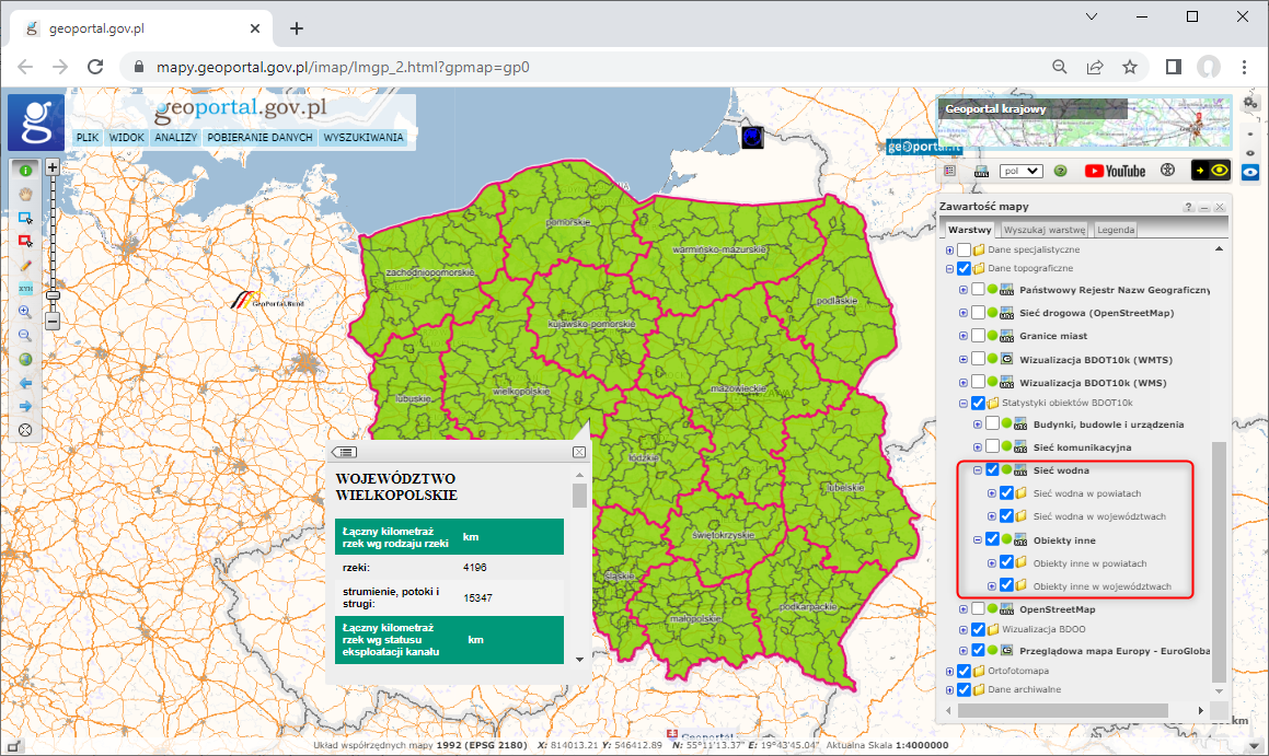 Przygotowane statystyki dostępne są również w serwisie www.geoportal.gov.pl w warstwach „Sieć wodna” oraz „Obiekty inne” widocznych w grupie warstw „Dane topograficzne” à „Statystyki obiektów BDOT10k”: