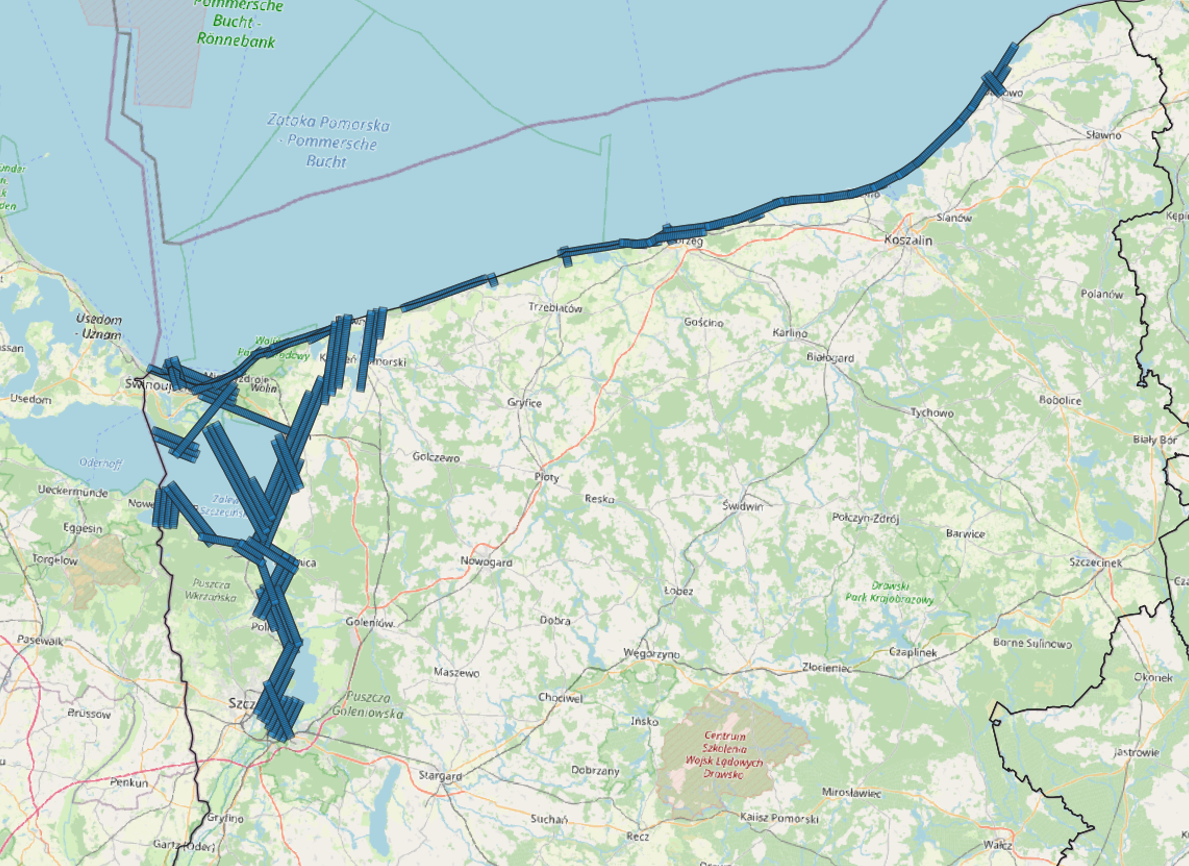 Do Państwowego Zasobu Geodezyjnego i Kartograficznego przyjęliśmy kolejne zdjęcia lotnicze z 2021 roku dla linii brzegowej Morza Bałtyckiego (2472 sztuk) o terenowym rozmiarze piksela 0.05 m. Zdjęcia zostały wykonane na zlecenie Urzędu Morskiego w Szczecinie. Ich szczegółowy zasięg przedstawiamy na poniższej ilustracji.
