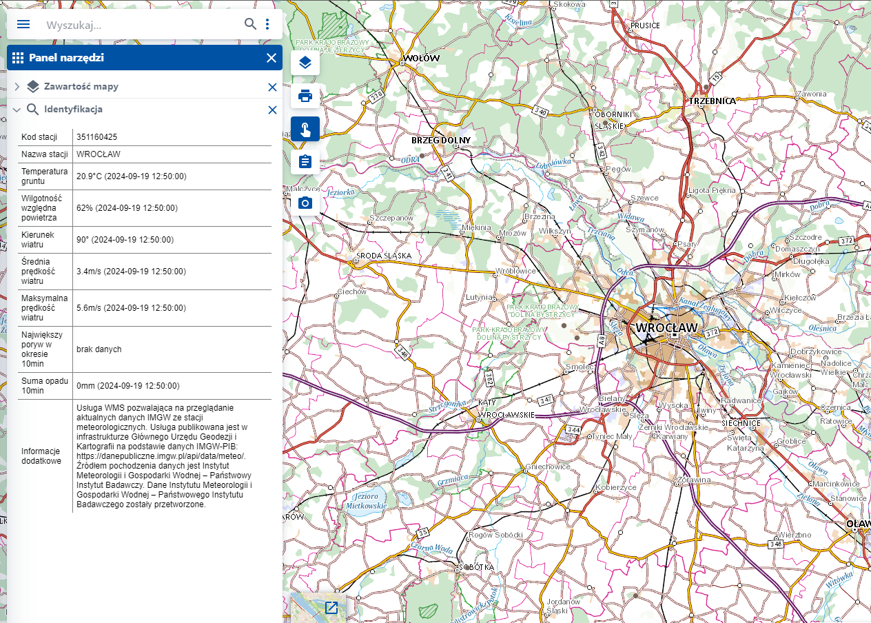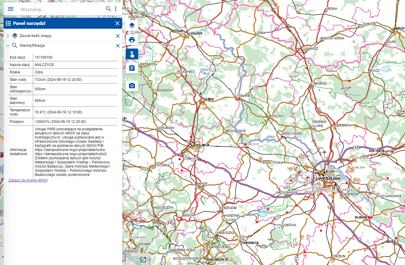 Warstwa „Stacje IMGW” zapewnia dostęp do bieżących danych hydrologicznych i meteorologicznych z całego kraju, udostępnianych przez IMGW-PIB, co wspomaga monitorowanie sytuacji pogodowej i hydrologicznej. Co pokazano na ilustracjach poniżej.