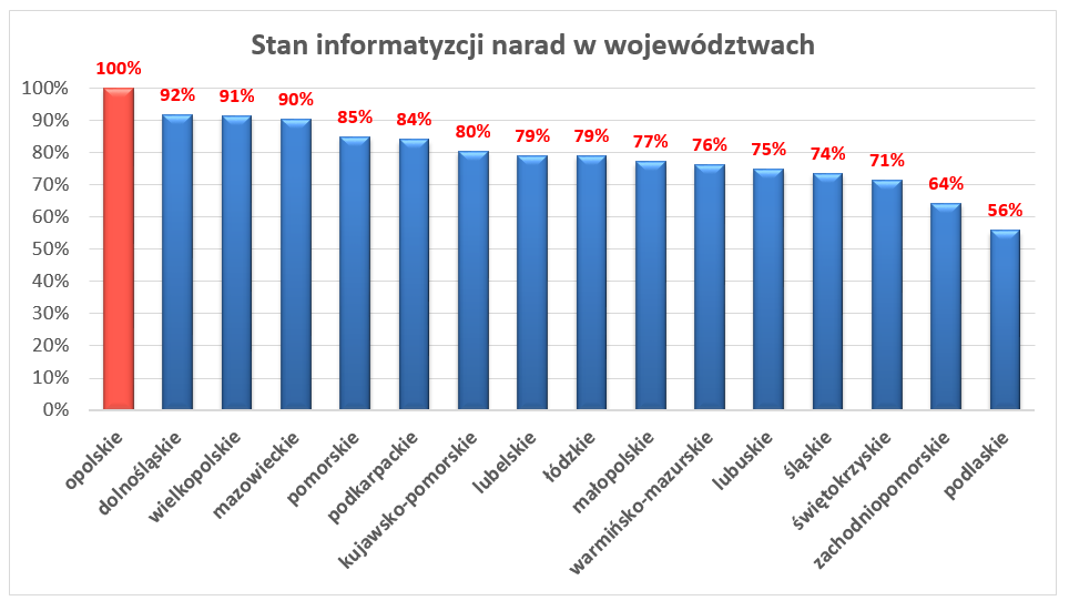 Obecnie już 328 powiatów, co stanowi ponad 86% wszystkich powiatów, wykorzystuje elektroniczne narzędzia do prowadzenia narad koordynacyjnych projektów sieci uzbrojenia terenu. Nadal województwo opolskie jest jedynym województwem, w którym wszystkie powiaty w pełni uruchomiły proces przeprowadzania narad koordynacyjnych w sposób elektroniczny.