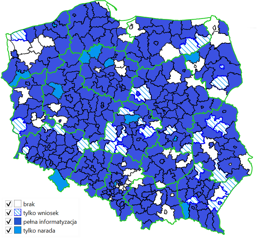 Warstwa jest na bieżąco aktualizowana na podstawie informacji uzyskiwanych z powiatów. Jeśli więc organ wdrożył system do prowadzenia narad koordynacyjnych w postaci elektronicznej, a nie jest to widoczne na mapie, wówczas prosimy o kontakt z Głównym Urzędem Geodezji i Kartografii.