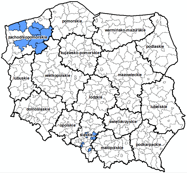 - zachodniopomorskiego: białogardzki, drawski, gryficki, kamieński, stargardzki, świdwiński, szczecinecki, wałecki;